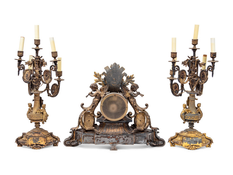 the mantel clock stamped 6 Ph. Mourey 66, the pair of five-light candelabra each stamped Ph. Mourey.