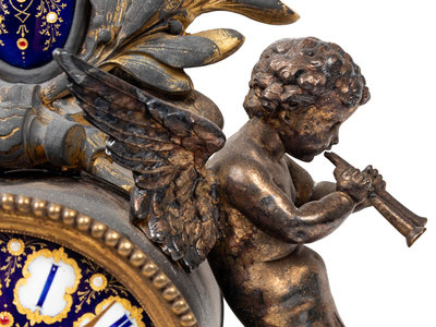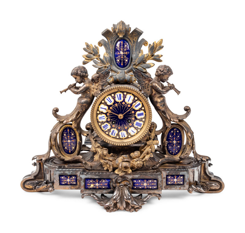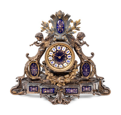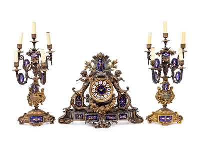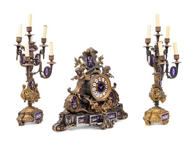 A Napoleon III Gilt Bronze and Enamel Clock Garniture