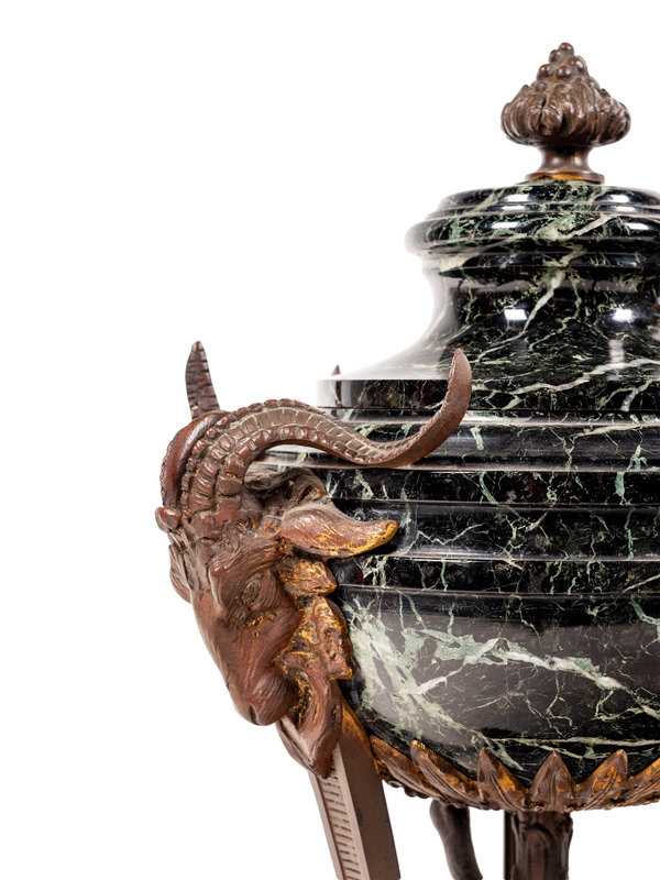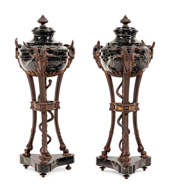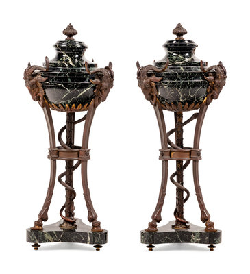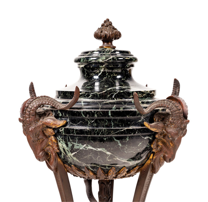 A Pair of Large Gilt Bronze and Marble Cassolettes