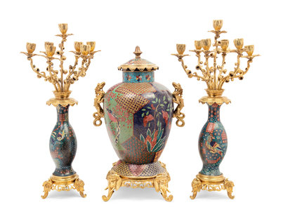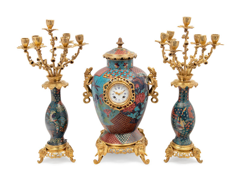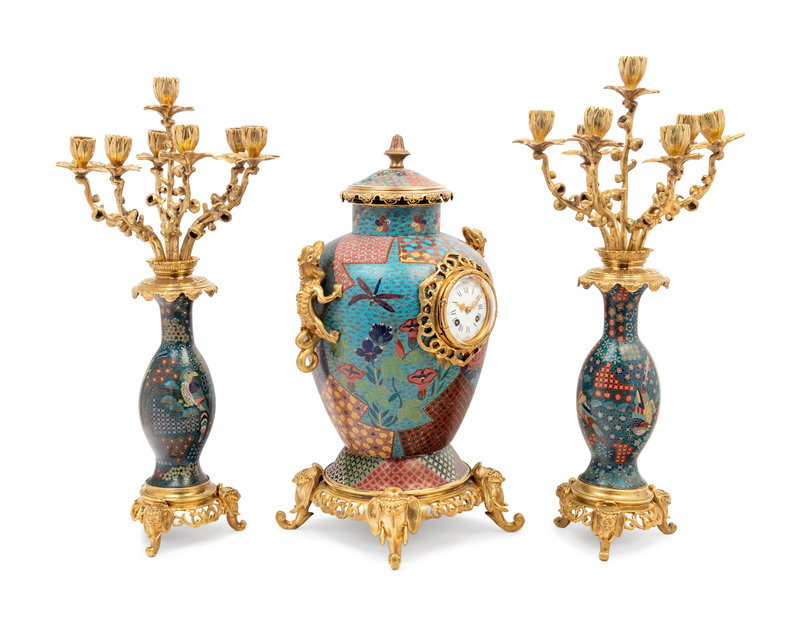 A French Gilt Bronze and Cloisonné Japonisme Clock Garniture