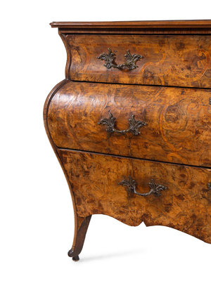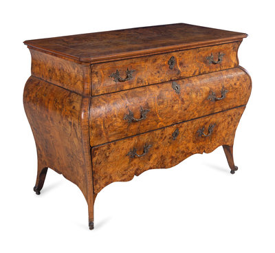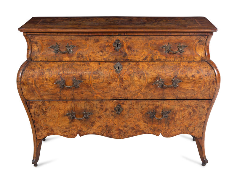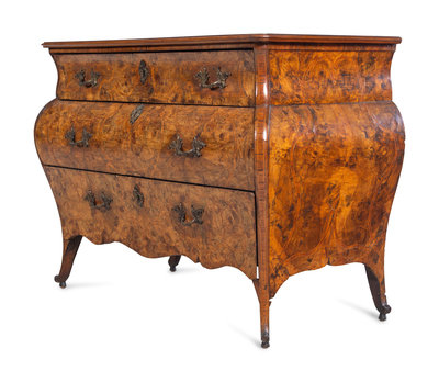 A Venetian Rococo Marquetry and Burl Radica Bombé Commode