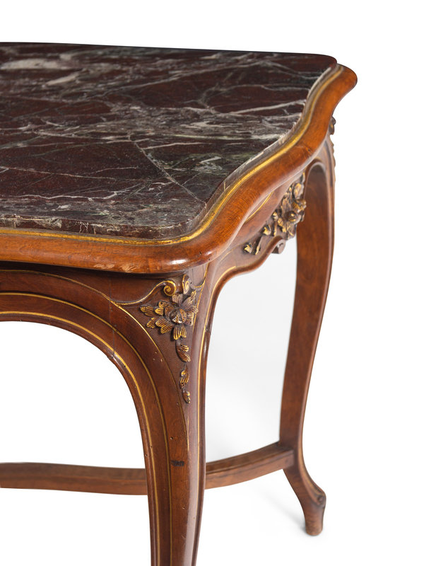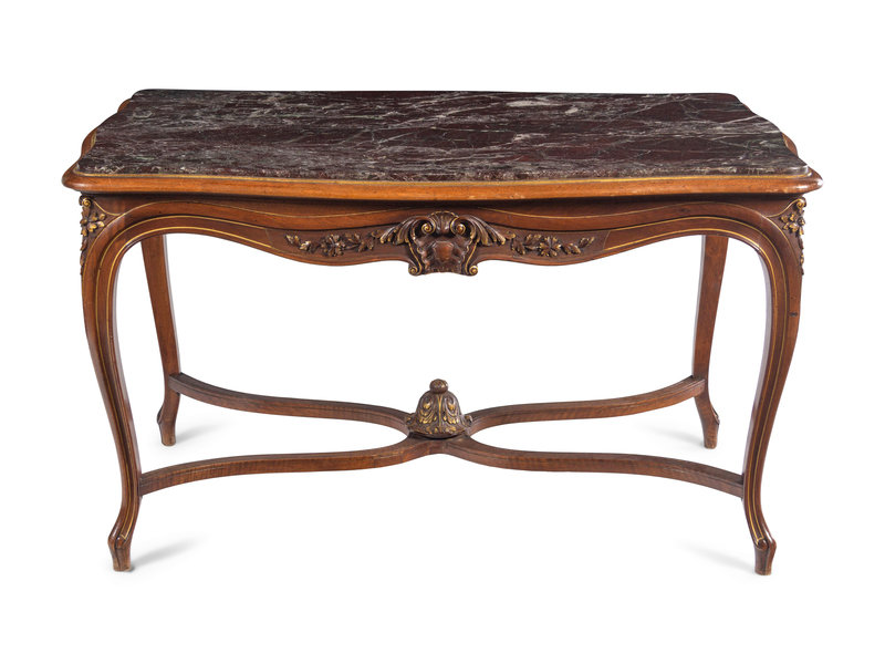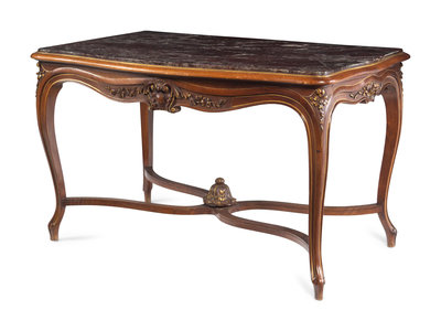 An Italian Louis XV Style Carved Walnut Marble-Inset Serpentine-Top Center Table
