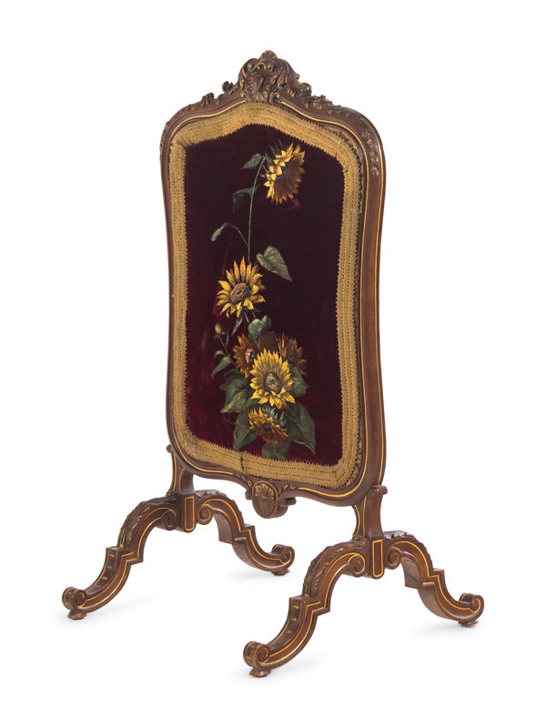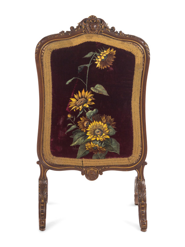 comprising a settee, four armchairs, four side chairs and a sunflower embroidered fire screen.