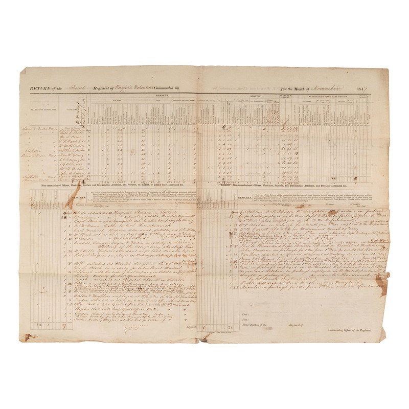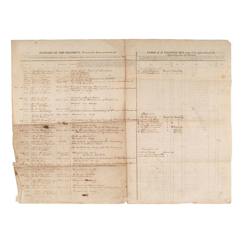 1p, 22 x 16 1/2 in., light soil, scattered ink marks, creasing at folds and along bottom right edge line. Unsigned. Regimental Return accounts for numbers of officers, non-commissioned officers, and enlisted men of the regiment and identifies current duty status.