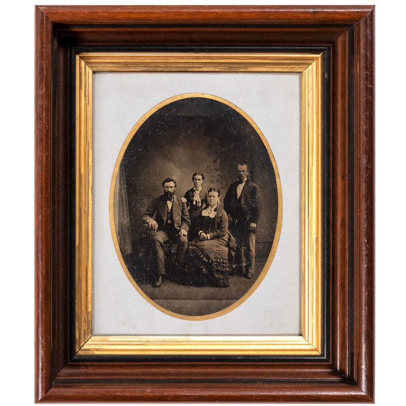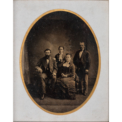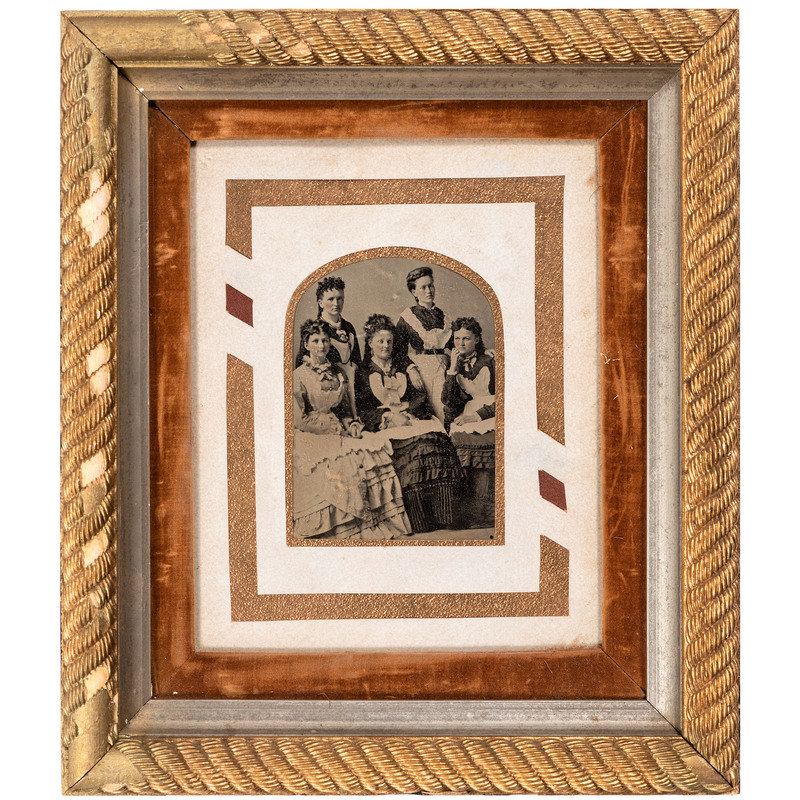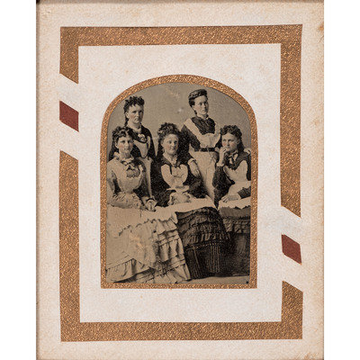 Studio group portrait of 5 well-dressed ladies. N.p.: N.p., n.d. 3 5/8 x 5 1/4 in. hand-tinted tintype. -- Studio group portrait of 2 men and 2 women. N.p.: N.p., n.d.. 6 x 7 7/8 in. tintype. -- Together, 2 tintypes, condition generally good, some surface abrasions, not examined out of frames.