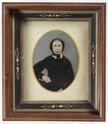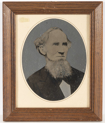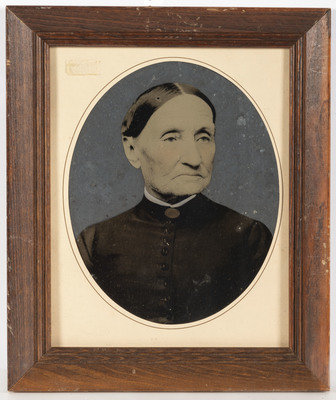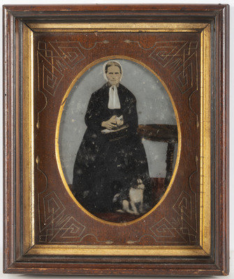 10 full plate, hand-painted tintype portraits of older men, ladies, and couples. Portraits are framed, including two matted and framed together, and range in total size from 10 x 12 in. to 17 x 13 in. Subjects include a rotund gentleman with a white beard and walking stick, framed with a seated woman in a blue dress, red shawl, and black plaid apron; a man with a wiry beard captured at close range; a severe-looking woman in a dark dress and white bonnet, holding a small basket and with a black and white dog seated at her feet; a woman in a dark dress and bonnet with a white lace collar, an elderly couple including a man wearing a polka-dotted bow tie, and 4 others.