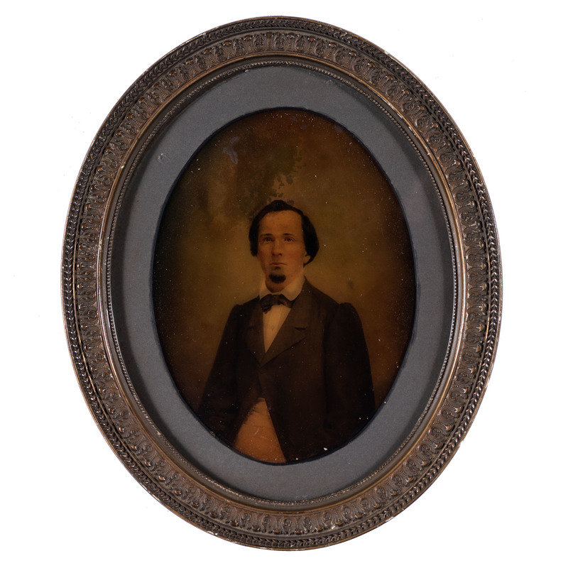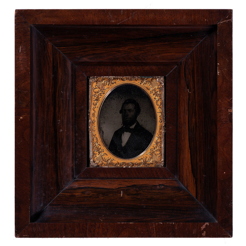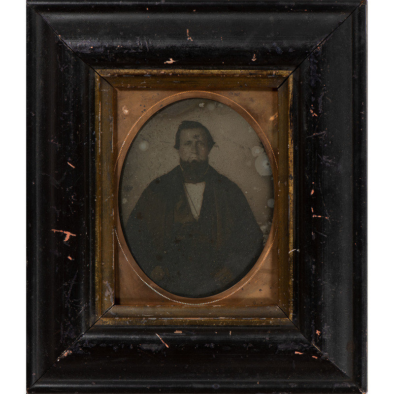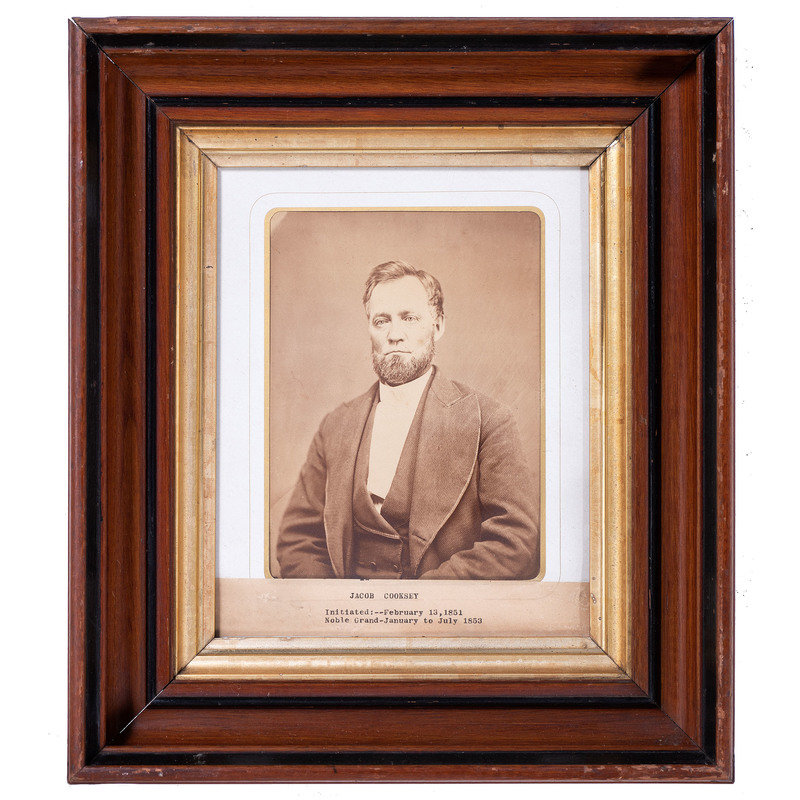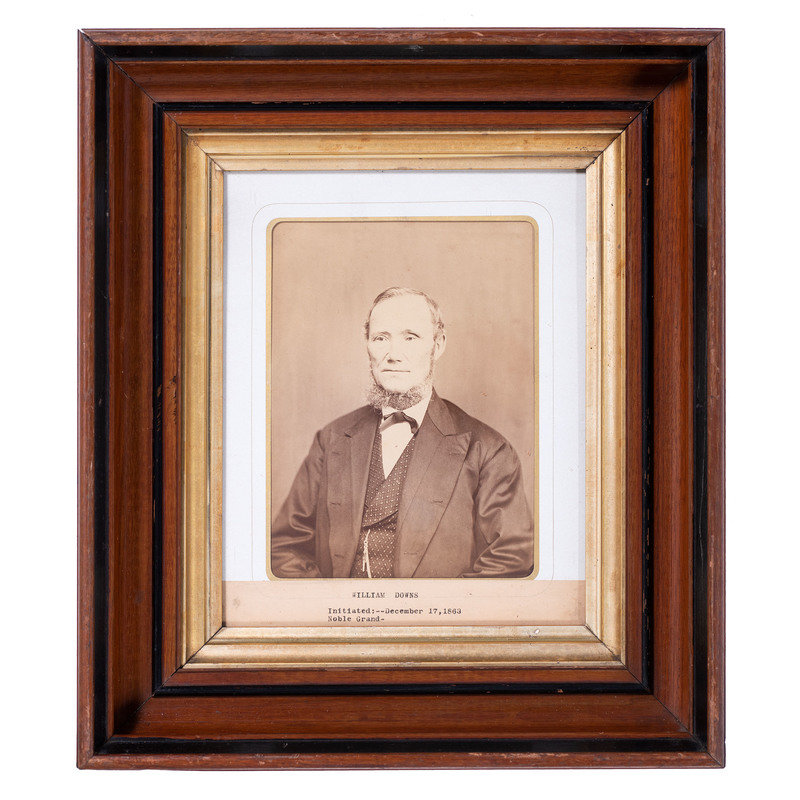 Albumen portrait of an Oddfellows member identified as Jacob Cooksey. N.p.: n.p., [ca 1850s]. 5 1/2 x 7 1/2 in. (sight), matted and framed to 13 1/4 x 15 1/4 in. Paper label framed with image features typeset identification of subject along with his initiation date (13 February 1851) and duration of service as Noble Grand (January through July 1853). -- Albumen portrait of an older Oddfellows member identified as William Downs. N.p.: n.p., [ca 1860s]. 5 1/2 x 7 1/2 in. (sight), matted and framed to 13 1/4 x 15 1/4 in. Paper label framed with image features typeset identification of subject along with his initiation date (17 December 1863). -- Full plate tintype portrait of a middle-aged man with full, curly beard. New Orleans: E. Jacobs, n.d. 5 7/8 x 8 in. (sight), matted and framed to 13 x 15 in. -- Hand-colored possible ambrotype portrait of a young man with goatee. New Orleans: Jac. Laufer, n.d. 6 x 8 in. (sight), matted and framed to 9 3/4 x 11 3/4 in. -- Albumen portrait of a man with a prominent goatee and interesting neck accessory. Bangor, ME: M.G. Trask, n.d. 5 x 7 in. (sight), matted and framed to 11 3/4 x 13 1/2 in. Photographer's blind stamp on mat. -- And 6 other portraits. -- Together, 11 framed portraits, condition generally fair, unexamined out of the frames.