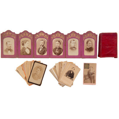 12 CDVs housed in accordion/fanfold CDV portfolio, lavender cloth with gilt floral designs in handmade red oilcloth sleeve. 3 x 5 x 1 in. when closed; fully open, 35.5 in. -- 276 loose CDVs, most not identified. All standard CDV except two – one at 2.25 x 3.5 in. from an unclear European country and one 1.5 x 2.25 in., with no photographer’s ID.