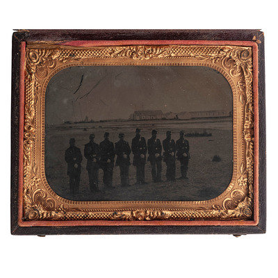 [CIVIL WAR]. Quarter plate tintype of Union artillery soldiers on the beach at Hilton Head, South Carolina. [Hilton Head, SC]: n.p., [1860s].