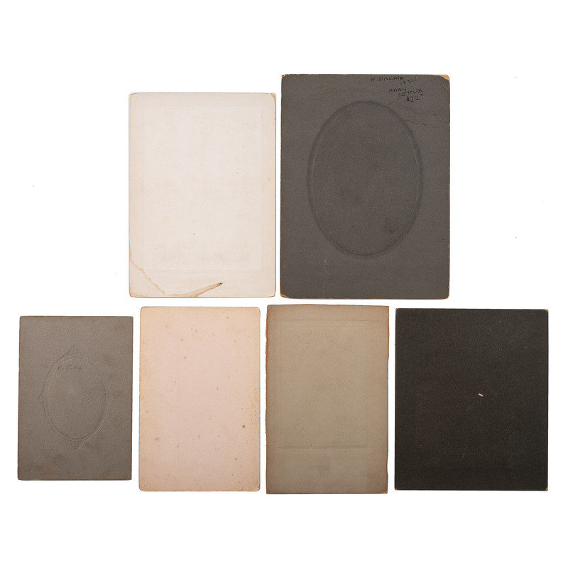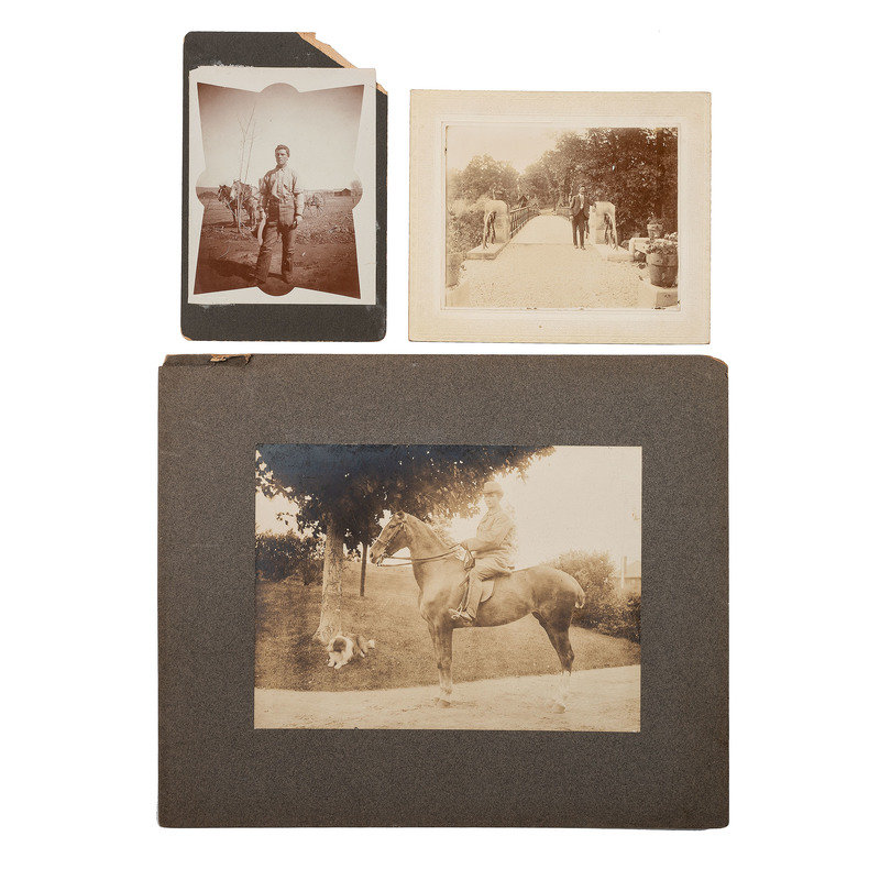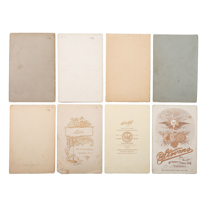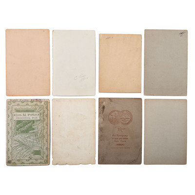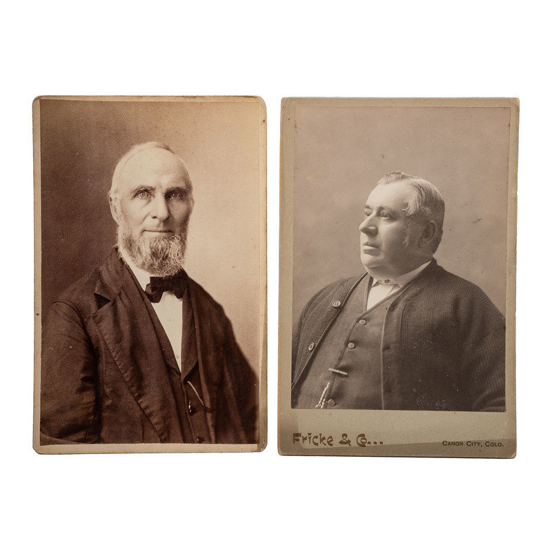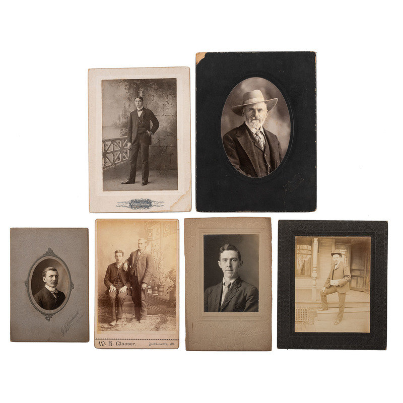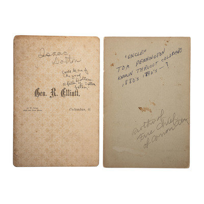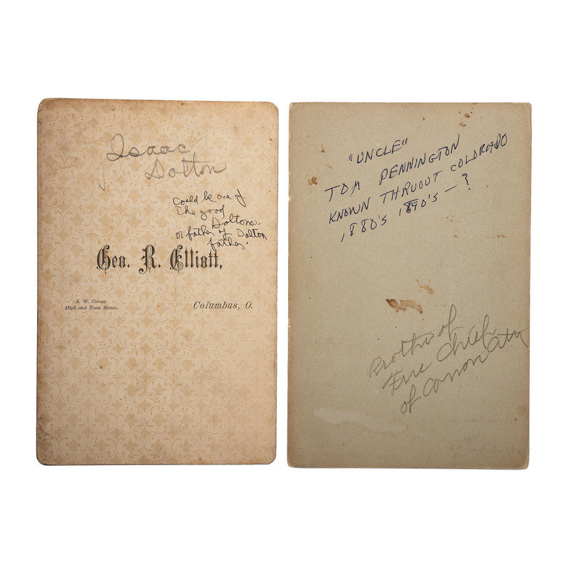 Portrait of three men in suits holding bowlers. N.p.: N.p., n.d. 3 1/4 x 5 in. large quarter plate tintype. -- Portrait of man identified as “Uncle” Tom Pennington, brother of Fire Chief of Canon City. Cañon City, CO: Fricke & Co., n.d. Cabinet photograph on cardstock mount. -- ELLIOTT, George R., photographer. Portrait of Isaac Dalton. Columbus, OH, n.d. Cabinet photograph on cardstock mount. Isaac Dalton (1801-1880), born in New Hampshire, moved to Columbus in 1831. He was a steward of the Ohio School for the Blind and on the special board of health during the cholera epidemic, 1849-1850. -- Portrait of a man on a horse with a dog under a tree. N.p.: N.p., n.d. 6 x 8 in. on cardstock mount. -- DeWEES, Mrs. Ida M., photographer. Photograph of a memorial CDV or cabinet portrait within a wreath. McArthur, OH, n.d. Cabinet photograph on cardstock mount. -- And 235 other photographs, including 2 tintypes, most cabinet photographs. Together 240 photographs, condition varies, most in fair to good condition.