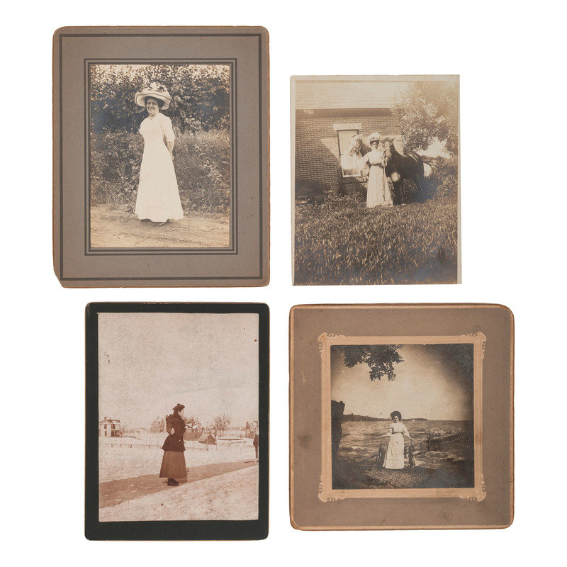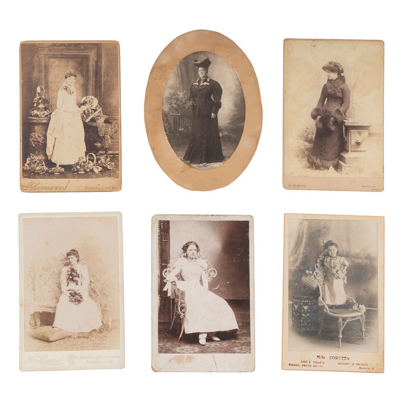 Portrait of Mademoiselle Coretta, a little person performer. Boonton, NJ: Wendt, n.d. Cabinet photograph on cardstock mount. -- Portrait of woman wearing a fur collar, cuffs and muff. New York: J. Ludovici, n.d. -- Portrait of three women, possibly sisters. Denver. W.A. Bradleys', n.d. Cabinet photograph on cardstock mount. Note to verso indicates it was taken in the Palace Photo Railroad Car. -- Outdoor portrait of a woman holding two full lines of the day's catch. N.p.: N.p., n.d. 3 1/4 x 3 1/4 in. photograph on cardstock mount. -- And 251 others, including 1 CDV-sized tintype and 4 albumen CDVs, most others cabinet-sized. Together, 255 photographs, condition varies.