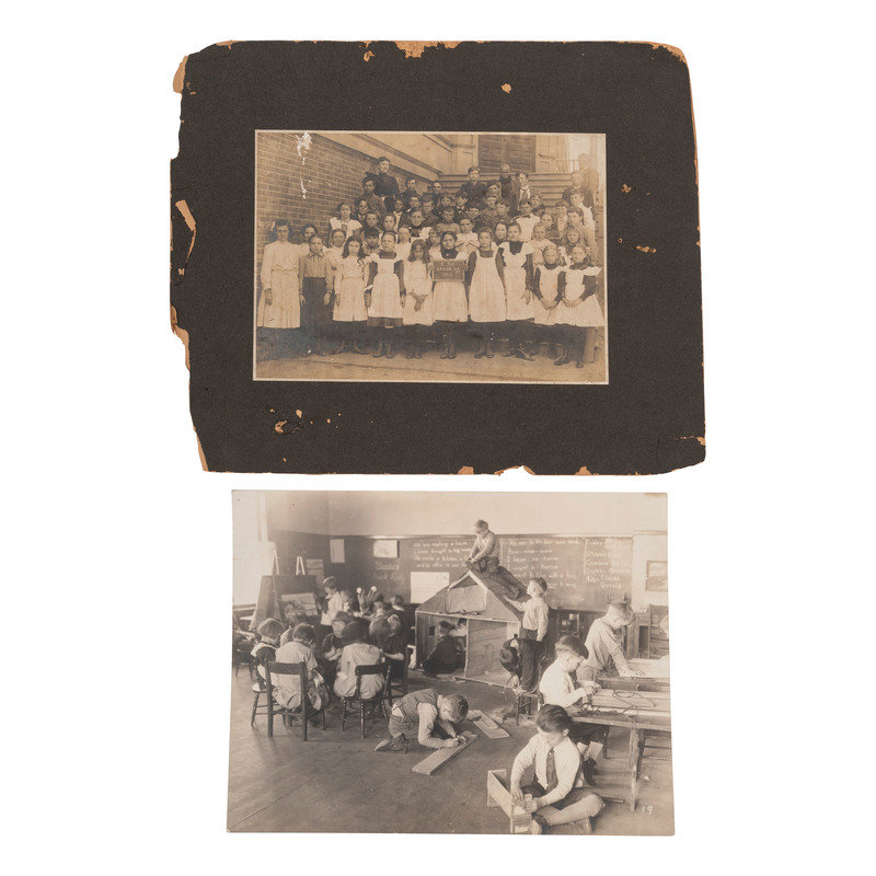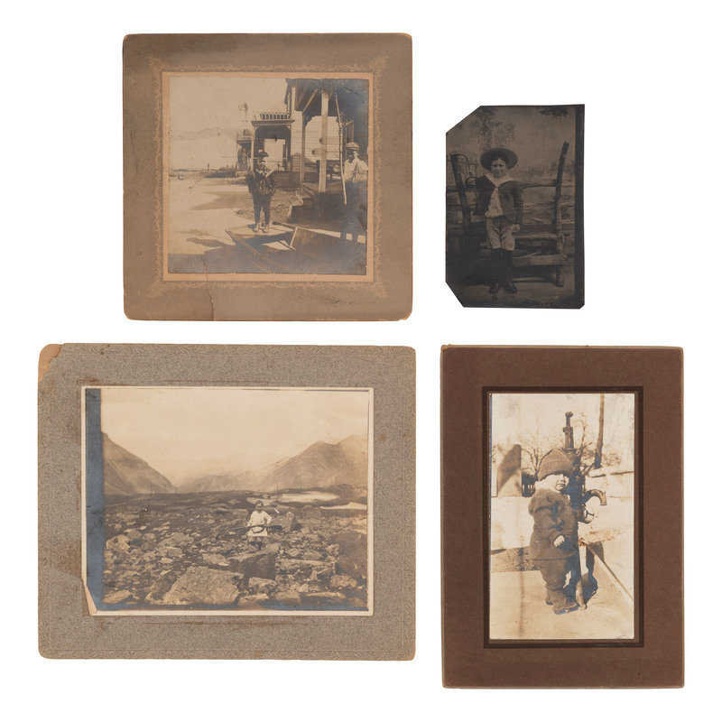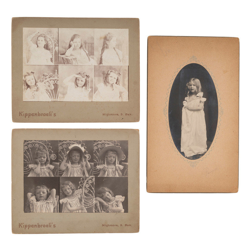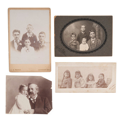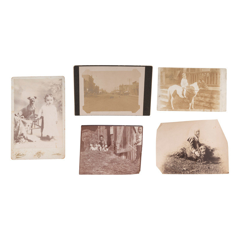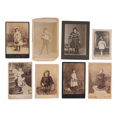 Portrait of identified toddler and her dog. Lockhart, TX: Main, 1899. Cabinet photograph on cardstock mount. Period inscription to verso "Sadie Isabel Bunton. Age one year, September 11th, 1899, and her dog Topsy. -- Portrait of a girl wearing rollerskates with flowers in her hair and a basket. Ogdensburg, NY: Dow's Studios, n.d. Cabinet photograph on cardstock mount. -- Studio portrait of a toddler with a hoop. Pittsburgh, PA: Elite, n.d. Cabinet photograph on cardstock mount. Pencil identification to verso tentatively identifies the subject. -- Portrait of four identified siblings. Jefferson, WI: J.A. Fisher, n.d. Cabinet photograph on cardstock mount. Period inscription identifes the subjects and their ages to verso: "Willie 9y. 7m, Ernie 17y. 5m, Allie 7y. 7m., Eddie 13y 11m." -- Studio portrait of four young girls. Cañon, CO: Royal Hubbell, 1898. 5 1/2 x 2 1/4 in. photograph on cardstock mount. Photographer's imprint to recto, pencil inscription identifying the subjects as "The Marsh Family" to verso. -- And 202 other photographs, including 2 tintypes, 2 CDVs, the rest mostly cabinet photographs. Together, 207 photographs, condition varies from fair to good.