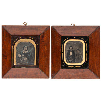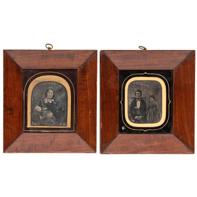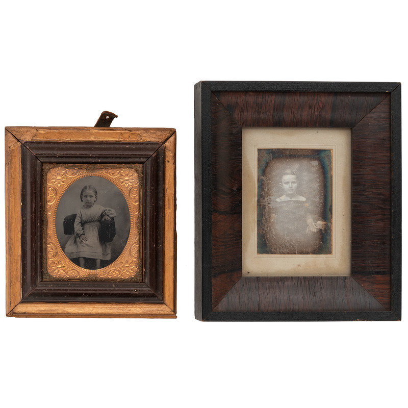 Quarter plate ambrotype of a mother holding her baby across her lap (significant loss to emulsion and lacquer, unexamined out of the frame). -- Quarter plate ambrotype of a father sitting next to his standing young child (significant loss to emulsion and lacquer, unexamined out of the frame). -- Quarter plate daguerreotype of a young girl wearing an off-the-shoulder dress (tarnishing to edges, loss to emulsion, soiling to mat, unexamined out of the frame). Frame verso with partial remainder of "Globe Art Company" sticker affixed. -- Sixth plate tintype portrait of a young girl seated in a fringed chair (minor surface imperfections, oxidation to preserver, unexamined out of the frame). Pencil inscription on frame verso reads, "taken in year / 1861." -- Together, 4 framed photographs.
