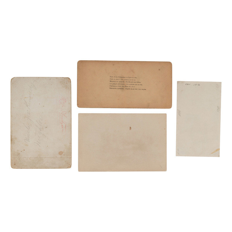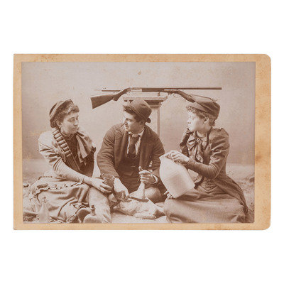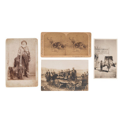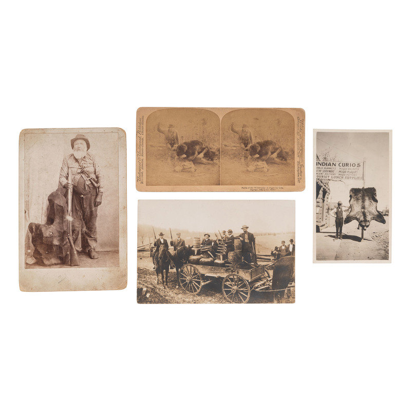 Studio portrait of "Uncle Joe Kennedy." N.p.: N.p., n.d. 3 7/8 x 5 1/2 in. cabinet photograph on cardstock mount. Contemporary pencil inscription to mount verso. -- Outdoor image of armed men and a wagon laden with distilling equipment. N.p.: N.p., n.d. 6 1/2 x 4 1/4 in. photograph. -- Outdoor portrait of a man with a bearskin outside an "Indian Curios" shop. N.p.: N.p., n.d. 3 1/4 x 5 1/2 in. photograph. -- Studio portrait of "sporting girls." N.p.: N.p., n.d. 5 5/8 x 3 7/8 in. cabinet photograph on cardstock mount. Two women share a glass of moonshine next to a man skinning fowl. Two rifles are mounted on a plinth behind them. -- BARKER, George, photographer. Perils of the WIlderness - A Fight for Life. New York, etc.: Underwood & Underwood, 1893. 6 1/8 x 3 1/4 in. albumen stereoview on cardstock mount. -- Together, 5 photographs, condition generally good.