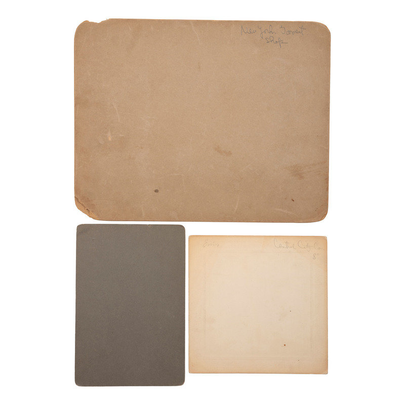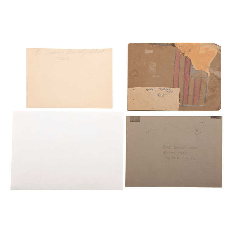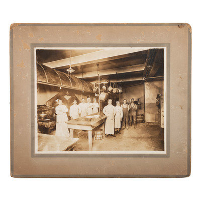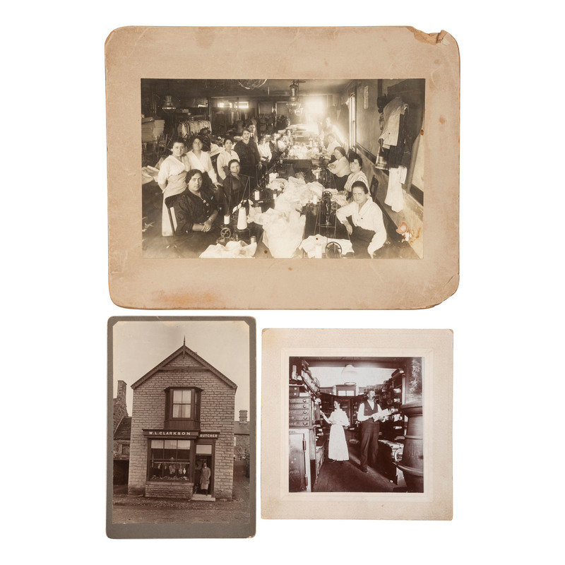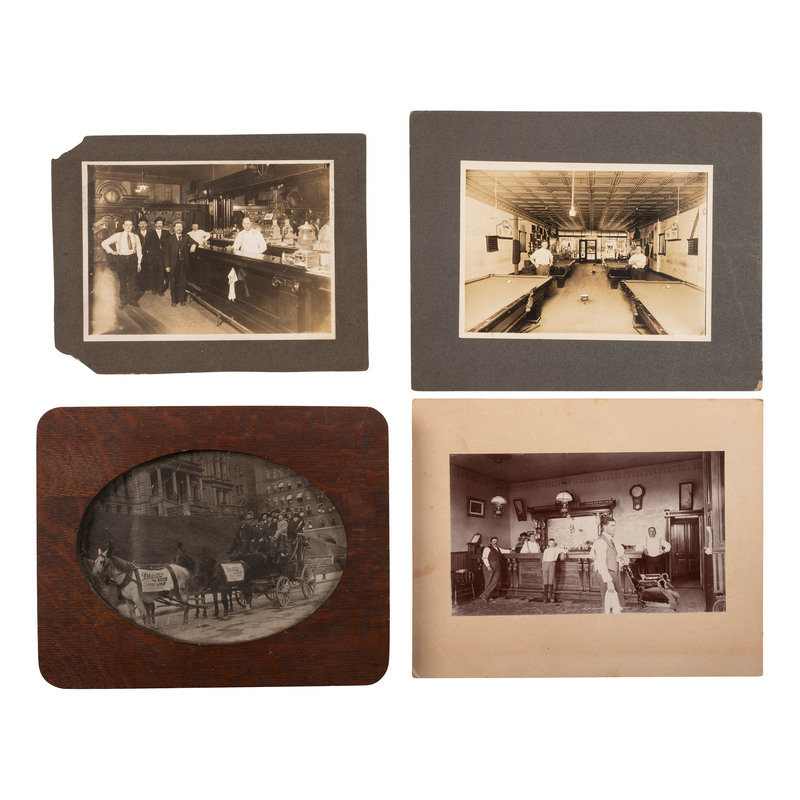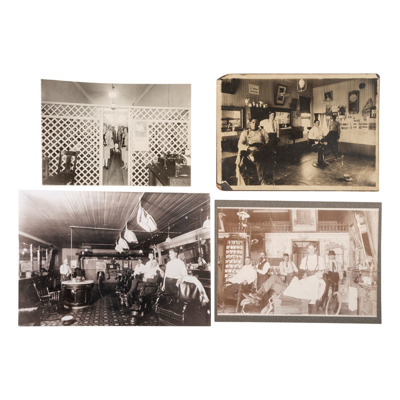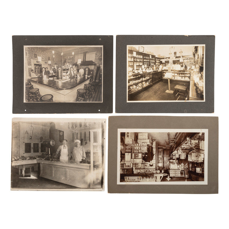 Interior of pool hall. N.p.: N.p., n.d. 7 1/8 x 5 in. albumen photograph on cardstock mount. Two men stand among pool tables. Spitoons are spaced on the floor and a bar and barber chairs are visible in the background. -- Indoor portrait of four men in a barbershop. [Sacramento, CA?]: N.p., [ca 1912]. 7 x 5 in. photograph (chipping to edges). Taken during an election, the walls are papered with several candidate advertisements, including one for Perley K. Bradford (1872-1932). He was elected as Supervisor of the fifth supervisorial district of Sacramento County in 1912. -- Interior view of a shop with its clerk and proprietor. N.p.: N.p., n.d. 8 1/8 x 5 in. photograph on cardstock mount. The two men, one wearing an apron behind the counter are surrounded by advertisements and products including Christie's Fig Bar Biscuits, "Salada" Ceylon Tea, and Orange Meat. -- Indoor portrait of seamstresses in the Garment District. [New York?]: N.p., n.d. 8 x 5 in. silver gelatin photograph on cardstock mount (light surface scratches, a few spots, abrasion to lower right corner). Women sit at their sewing machines surrounded by fabric and garments. -- Indoor group portrait of the kitchen staff of a hotel or restaurant. N.p.: N.p., n.d. 10 x 8 1/8 in. silver gelatin photograph on cardstock mount (light surface abrasions; scuffing and chips to mount). Seven men pose in their kitchen whites in their workspace. They are joined by two men in overalls. -- And 40 others. Together, 45 occupational photographs.