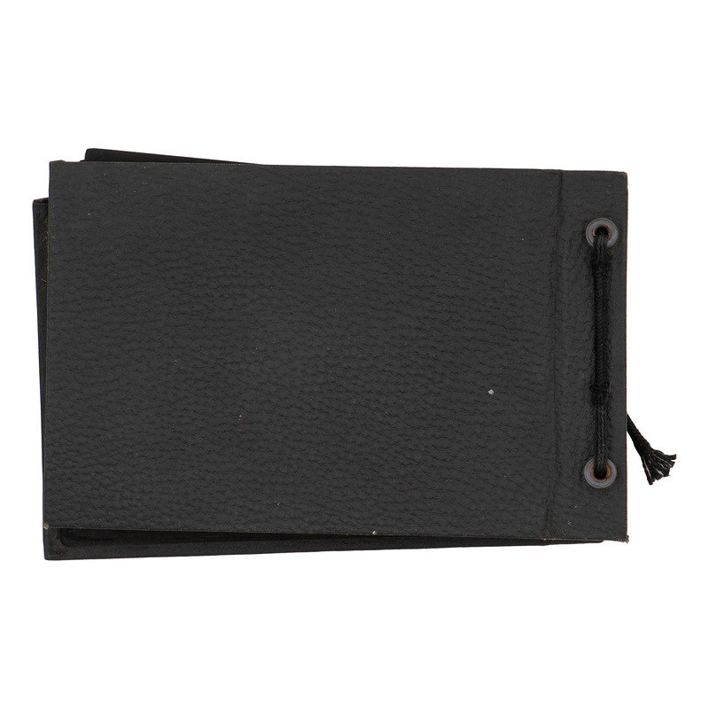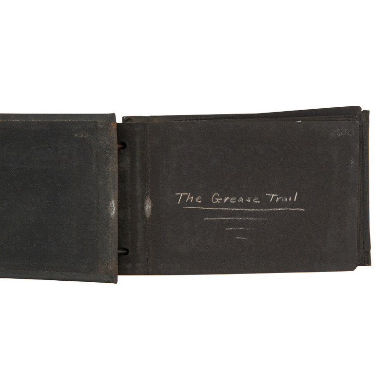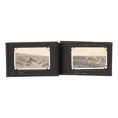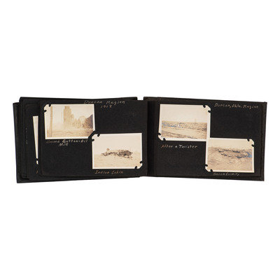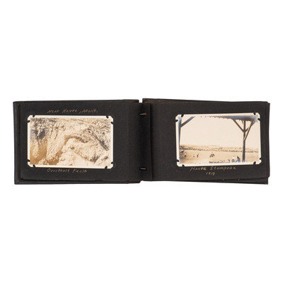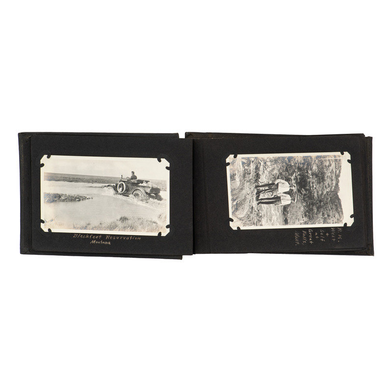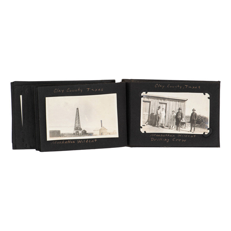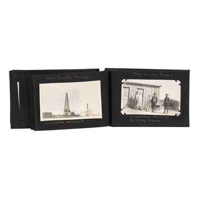 Album 5.25 x 8.5 in., string-tied spine. Front free endpaper titled in silver ink: “The Grease Trail." The album has 83 images: 3.5 x 5.5 (62); 2.25 x 4.25 (4); 2.5 x 3.5 (17). First page is a postcard with cartoon “All Around Casper.” The upper left cartoon is captioned: “The latest thing out putting your money into oil wells” showing a man dropping a bag of coins down a pipe with a promoter waiting below to catch it, the oil sands and natural gas off to the side of the pipe. The other images document what seems to be exploratory trips to: {1917} Big Muddy, WY; Great Falls, MT; Blackfeet Reservation, MT; Glacier Park; Havre, MT; Near Powder River, WY; “Cement Region;” {1918} Duncan Okla. Region; Gotebo, OK; Avant, OK; Wichita Mountains, OK; Big Sandy Draw, WY; {1919} Antieline Oil Mountain; LaSalle Co., TX; Webb Co., TX; Clay County, TX.