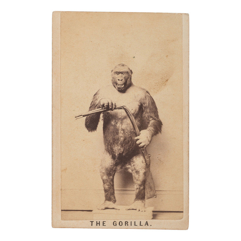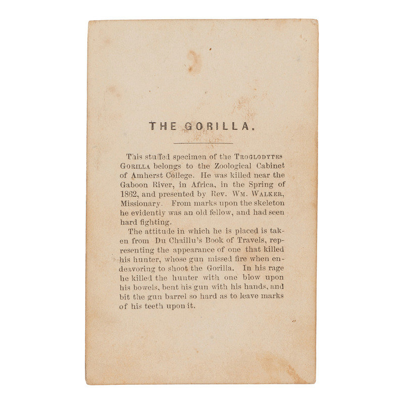 Featuring a large stuffed gorilla, posed with a bent rifle in his hands. This gorilla specimen was presented by the Reverend William Walker, an Amherst alum and West African missionary, to Edward Hitchcock, the president of Amherst College. The gorilla was reportedly killed near the Gabon River during the spring of 1862, stuffed by Jillson of Feltonville, and mounted by Walker's oldest son. The pose of the gorilla in this photograph was inspired by Du Chaillu's Explorations and Adventures, in which a gorilla killed a hunter, took his gun, and bit it so hard enough to leave marks on the barrel.