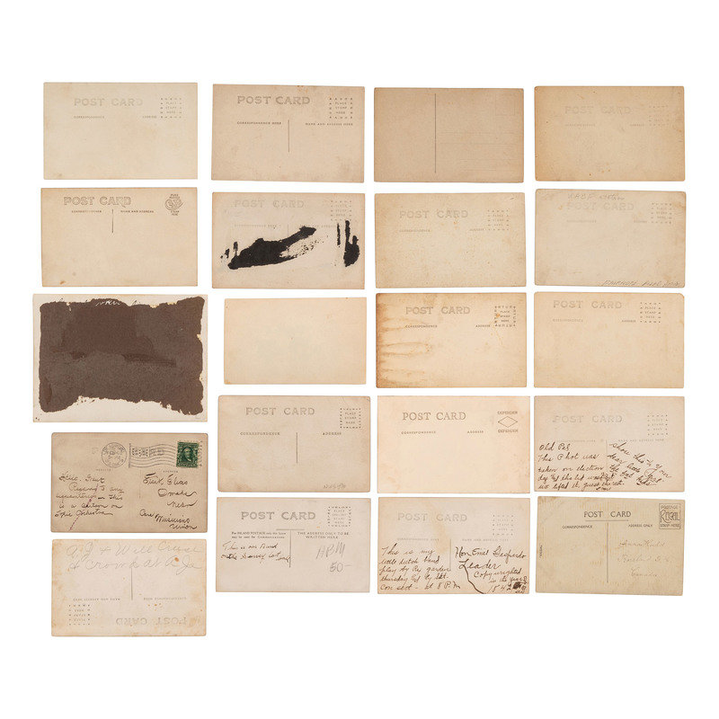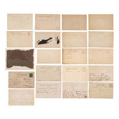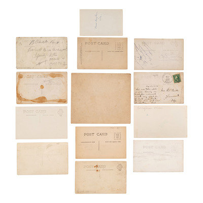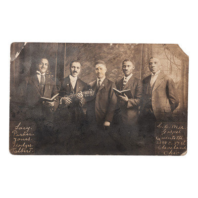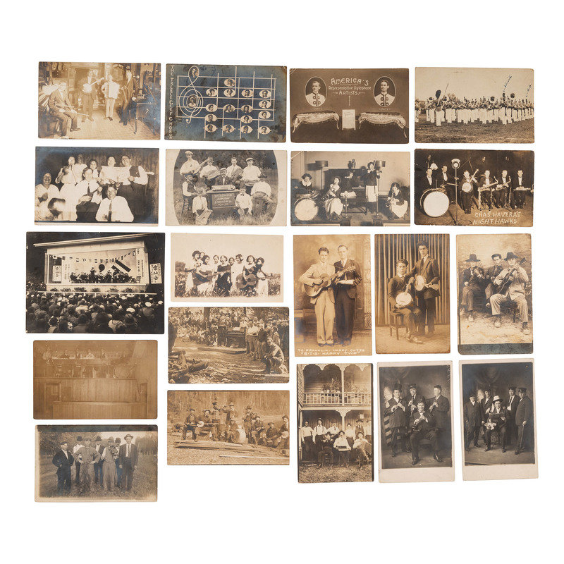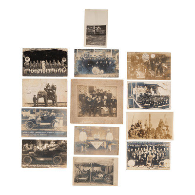 [With:] Lucy. Parker. Jones. Hodges. Talbert. C & M. A. Gospel Quintette. 2140 E. 37 St. Cleveland, Ohio. Studio portrait of an African-American gospel quintette. Two men posed with open books, possibly hymnals, and one with a mandolin. -- Sigund Thorlakson's Band. Season 1912. Band members posed with their uniforms and instruments. Signed to verso by Sigund Thorlakson. -- Saved through Christ and Consecrated to His Service. 3 children with musical instruments riding in a car labeled "Gospel Car." -- In Dug-Out on Front. A group of soldiers huddled around a stove with instruments. -- Zither-Club Almrausch. Livingston, ILL. 14 Jun. 1914. -- And 41 others. Together, 46 real photo postcards, condition generally good.