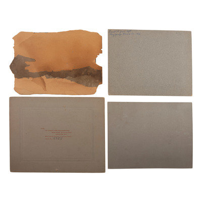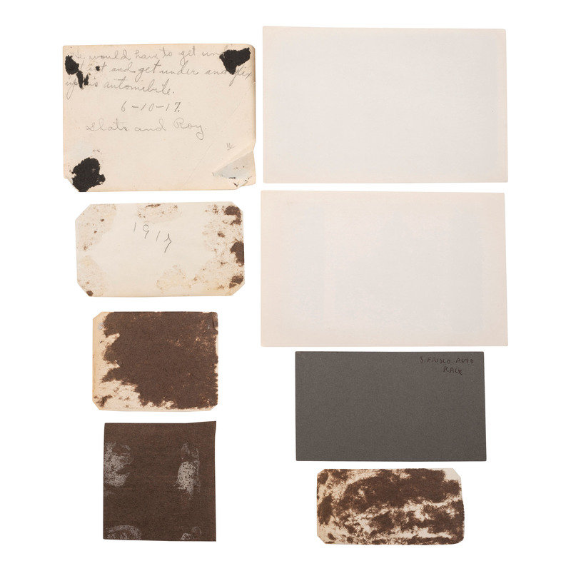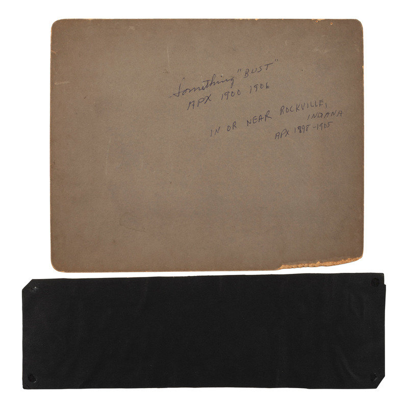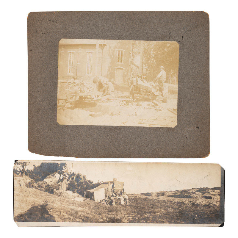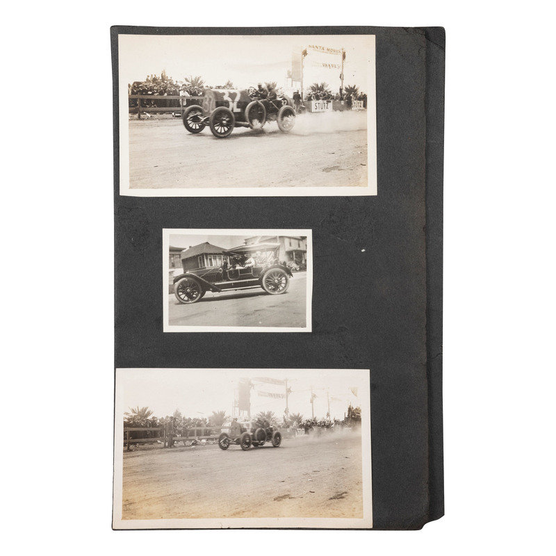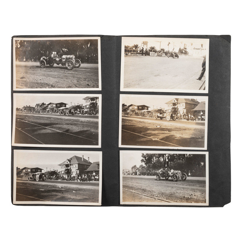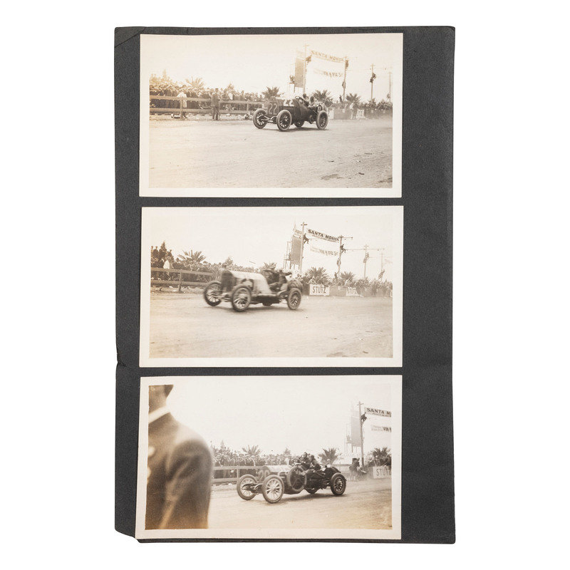 12 photographs of an auto race in Santa Monica, CA, ca 1910-1920, all 5 1/2 in. x 3 1/2 in. except for 1 snapshot 2 x 3 in. (all adhered to black paper mount, toning, some creasing). -- Early photograph of a group of men appearing to work to repair two mangled vehicles, with inscription on verso "Something 'Bust' APX 1900-1906 / In or near Rockville, Indiana." (Scattered ink marks on mount, light contrast, wear to mount).