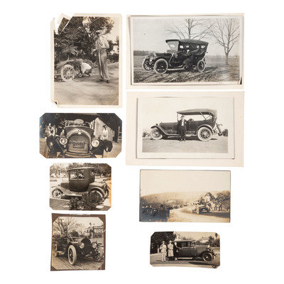 [With:] Approximately 30 albumen photographs and snapshots, mostly of unidentified subjects and locations, showing racing, auto shops, gas stations and attendants, and early automobiles often with owners posed nearby, ca early 1900s - 1930s. Sizes range from 8 x 10 in. to 2 x 2 in.