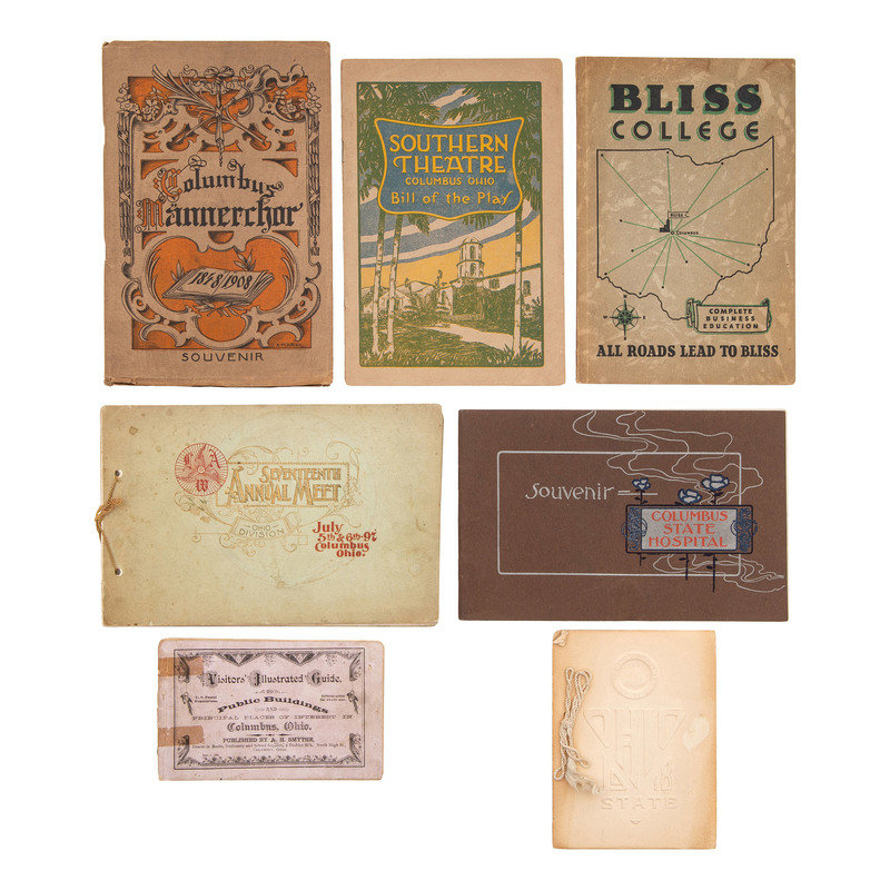 Smythe, A.H. Visitors’ Illustrated Guide to Public Buildings and Principal Places of Interest in Columbus, Ohio. Columbus: A.H. Smythe, ca 1900. Obl. 3.7 x 6 in., printed paper wraps, pages unnumb., 12 lithographs of buildings, 8 in color, one folding.