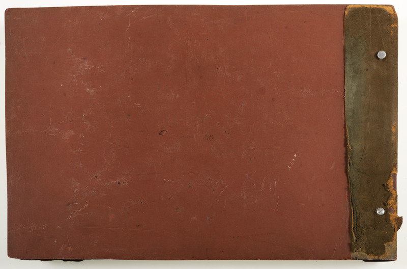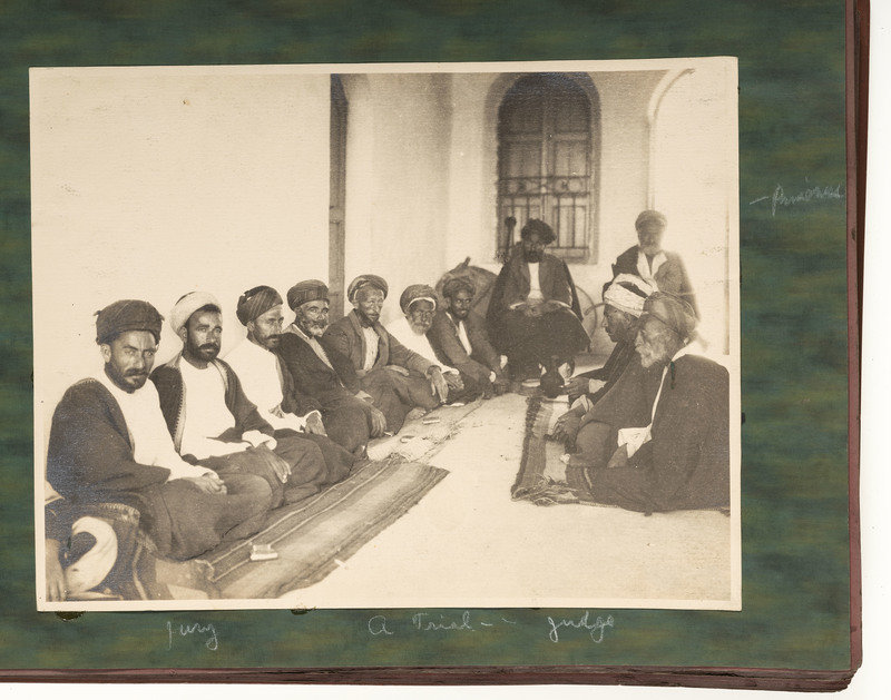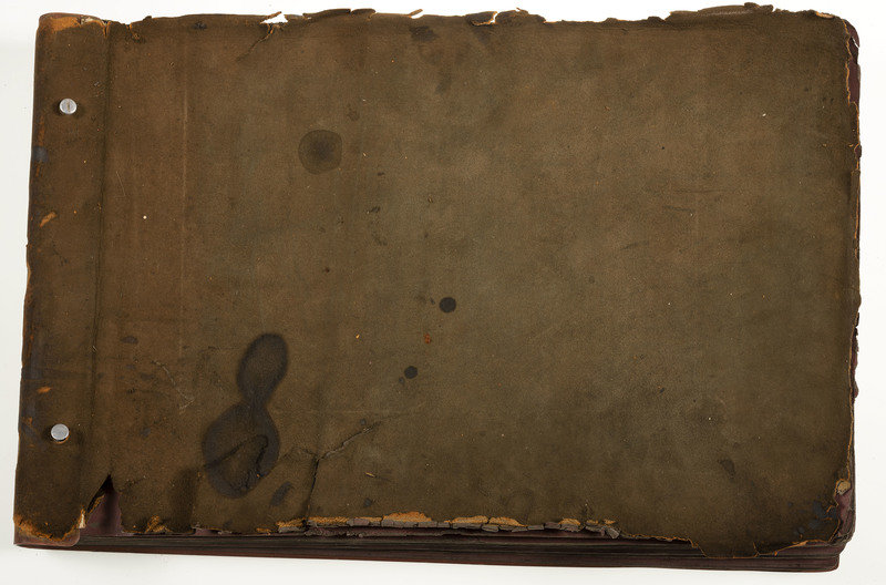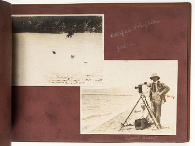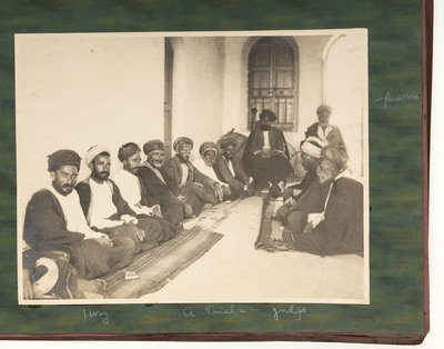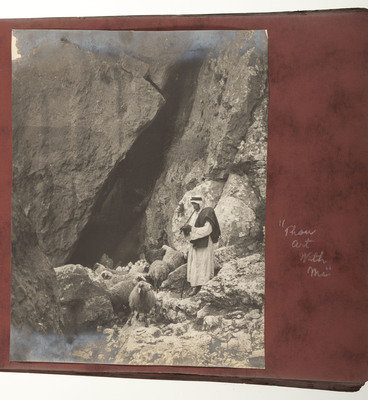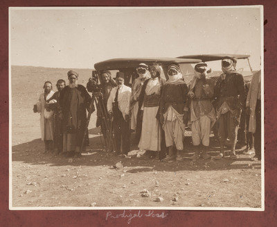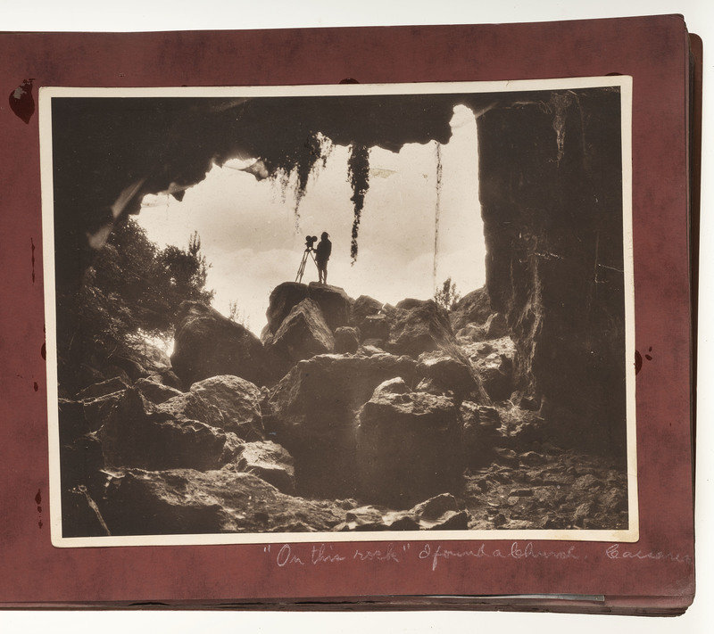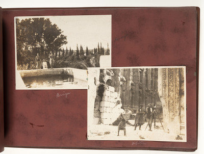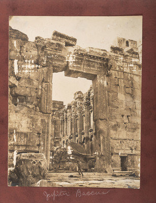 20 1/2 x 13 1/2 in. suede-bound album (lacking rear cover, chipping to edges, ink stains) with 72 large (average 12" x 10") silver gelatin photographs. Taken in the early 20th century, the images were taken in the Holy Land and capture both historic sites as well as the inhabitants of the region. Little is known of Temple; he was a lecturer from Los Angeles who traveled extensively, especially in the Levant and Arabian peninsula. Several photos show the photographer with his large camera on tripod. Other subjects include shepherds, a Samaritan "High Priest" and images of his congregation, a trial, the temple of Jupiter Baalbek (Lebanon), and the Dead Sea.