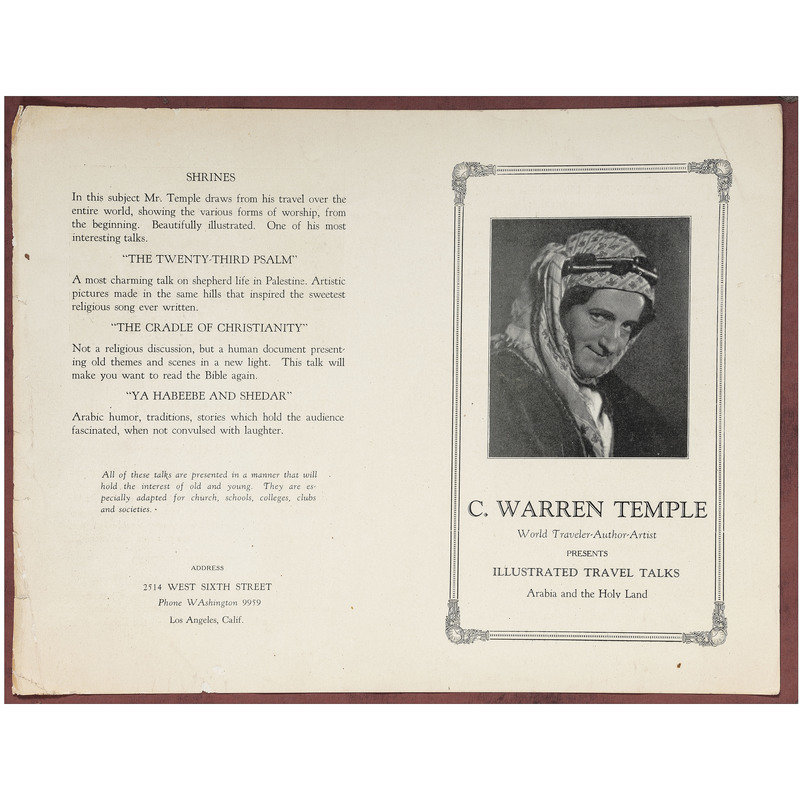 [With:] 4 copies: C. Warren Temple, World Traveler-Author-Artist Presents Illustrated Travel Talks, Arabia and the Holy Land. [Los Angeles]: n.p., [ca 1910s]. 11 1/4 x 8 1/2 in. program for lectures by Temple. He advertises that "All of these talks are presented in a manner that will hold the interest of old and young. They are especially adapted for church, schools, colleges, clubs and societies.