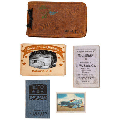 Midget Map of the Best Roads of Michigan (2.25 x 3.5in. folder with 1923 calendar on rear), folding map 9 x 11.5 in. With advertising from an Indiana realtor. Plus memo book, unused, Moskin’s advertising, Parkersburg, WV. And 1.75 x 2..5 in. card with Dart Mode G Trainer airplane