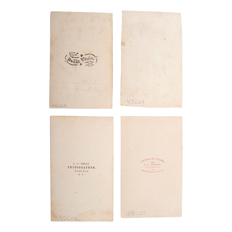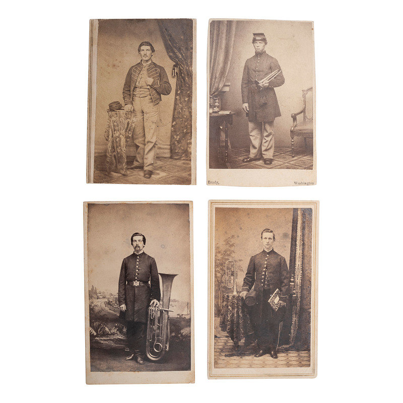 MILLS, J.C., photographer. Studio portrait of a musician in uniform standing next to his large saxhorn. Penn-Yan, NY: Mills, n.d. Photographer's imprint on verso. -- BIDDLE, J.E., photographer. Studio portrait of a musician in uniform, holding his hat and music, his trumpet on the table. Poughkeepsie, NY: Biddle, n.d. Photographer's imprint on verso. -- BRADY, Mathew, photographer. Studio portrait of a musician in uniform holding his bugle. Washington DC: N.p., n.d. Photographer's imprint on recto. -- WADE, Helia, photographer. Studio portrait of a soldier identified as James Wade in uniform, his kepi rests on a table with insignia visible. N.p.: N.p., n.d. -- Together, 4 CDVs on cardstock mounts, approximately 2 1/8 x 3 1/2 in., condition generally good.