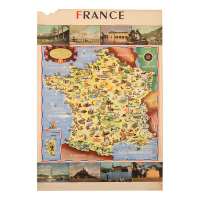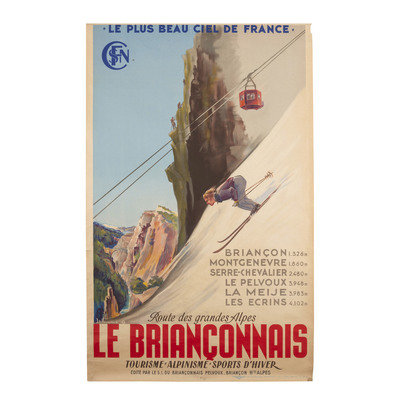 Société Nationale des Chemins de fer Français. Paris, France: France National Railways, [1946]. 24 3/8 x 39 1/2 in. poster (very small chip to right edge). -- France. Paris: Yves Alexandre, 1947. 24 3/8 x 39 in. (loss to upper right, toned). -- [POISSONNIÉ, J.R.]. Route des Grandes Alpes, Le Briançonnais. Monte-Carlo, Monaco: Imprimerie Monégasque, A. Jorio, [1950]. 24 3/8 x 39 5/16 in., poster (toned, light creasing and small tears at edges with occasional verso tape repairs).