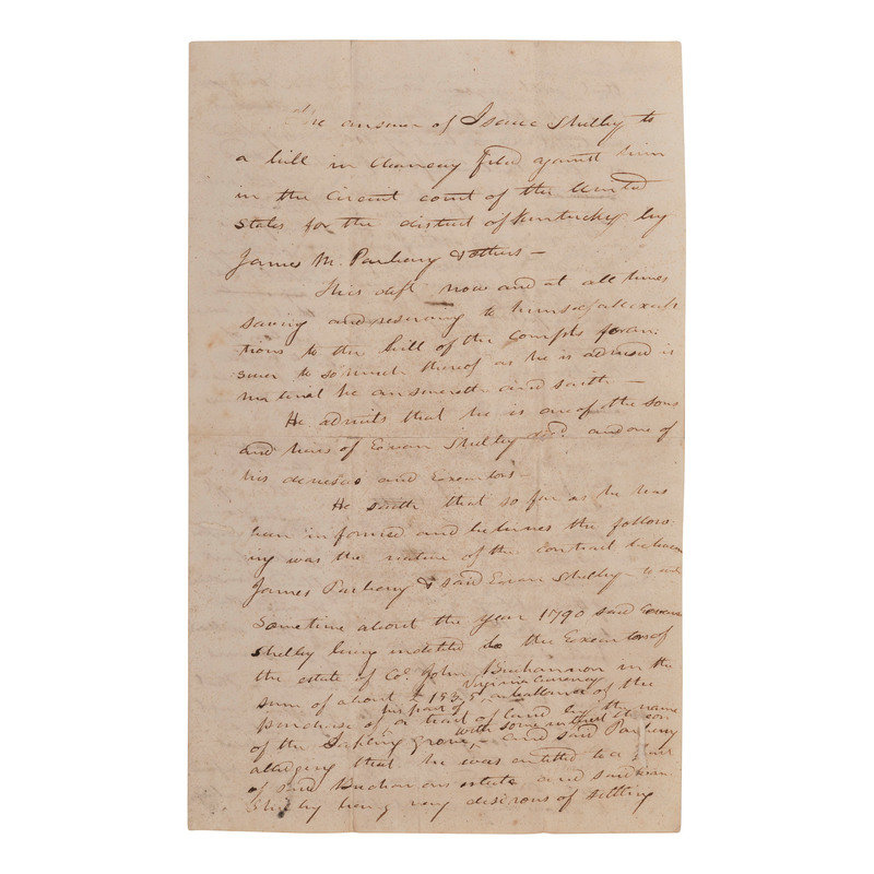 The answer of Isaac Shelby to a Bill in Chancery filed against him in the circuit court of the United States for the district of Kentucky by James M. Parberry & others. Kentucky, [ca early 1800s].
