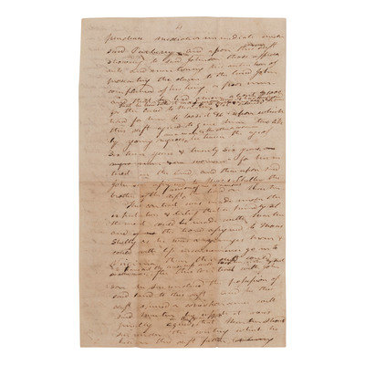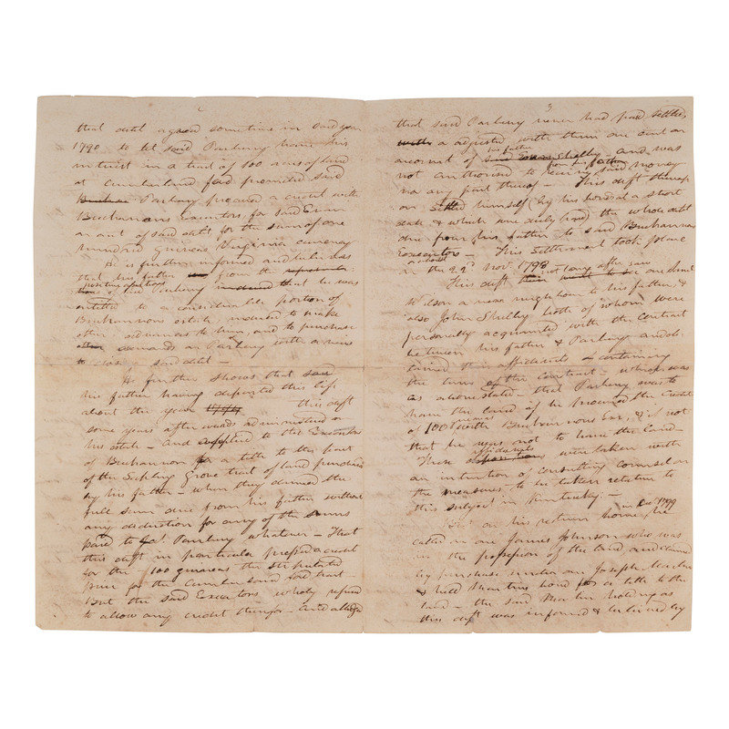 Unsigned and incomplete draft related to the ongoing legal dispute surrounding ownership of "Sapling Grove," a property in present-day Bristol, Tennessee, that was originally acquired by Shelby's father, French and Indian War veteran and militia officer Evan Shelby (1720-1794). Document outlines Isaac Shelby's understanding of "the nature of the contract between James Parberry & said Evan Shelby" beginning in 1790 then continues to outline events pertaining to the disputed parcel as they unfolded up until approximately 1800. Notable is a mention of Isaac Shelby's intent to trade a contesting party "two likely young negroes one a man & the other a woman between the ages of sixteen years & twenty-six years for his interest in the land..."