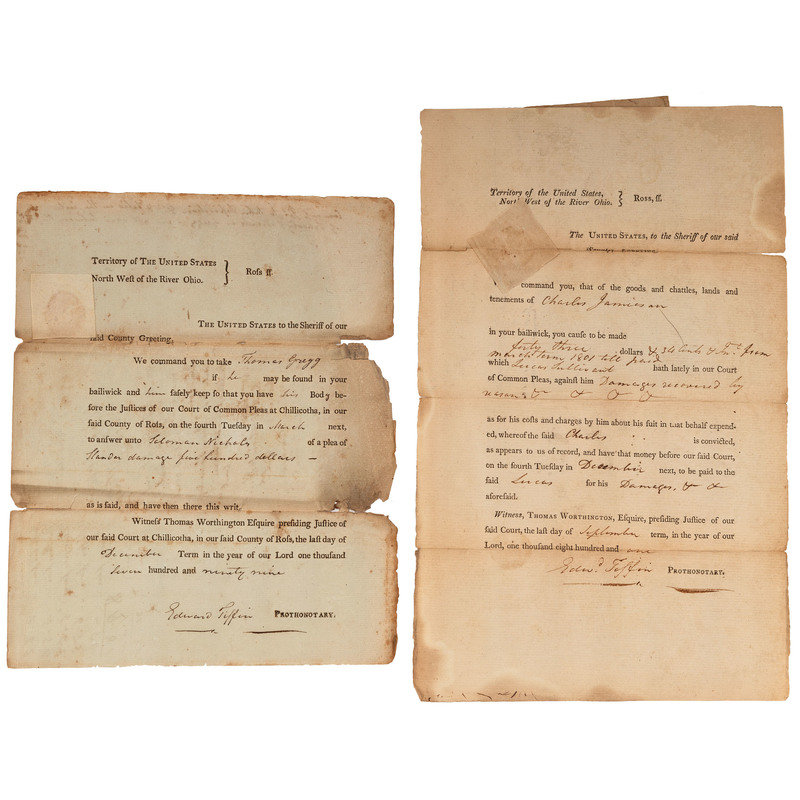 Arrest warrant for Thomas Gregg in Ross County, “Territory of the United States North West of the River Ohio.” 31 Dec. 1799. Signed by Edward Tiffin as Prothonotary. Tiffin would become the first Governor of the new state of Ohio in 1803 and serve until 1807.