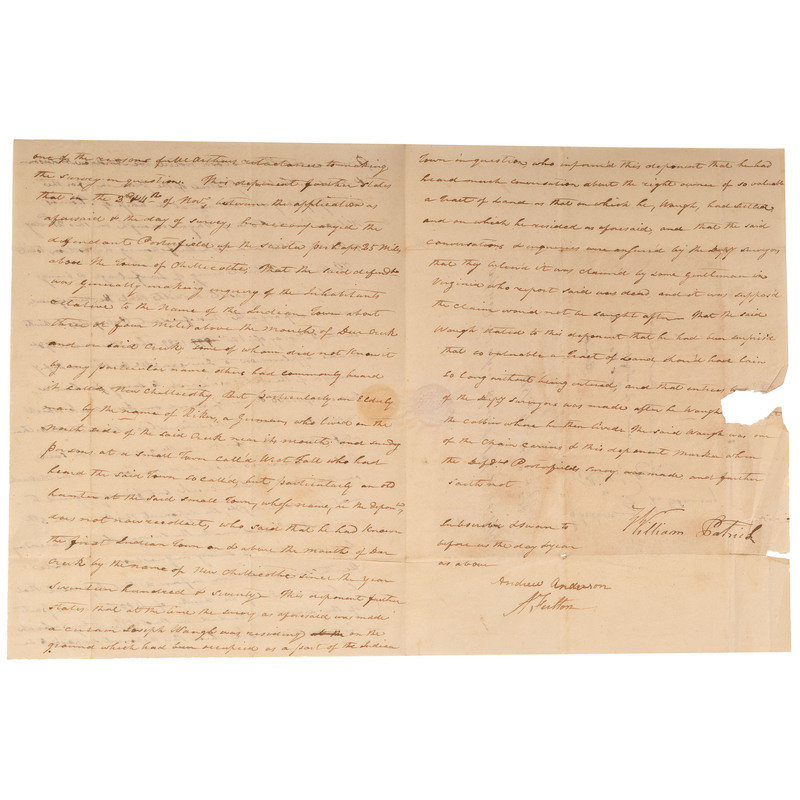 Manuscript deposition of a William Patrick, 3 pages, Nov. 4, 1815, describes the location of an Indian Town known as New Chillicothe on Deer Creek up the Scioto River.
