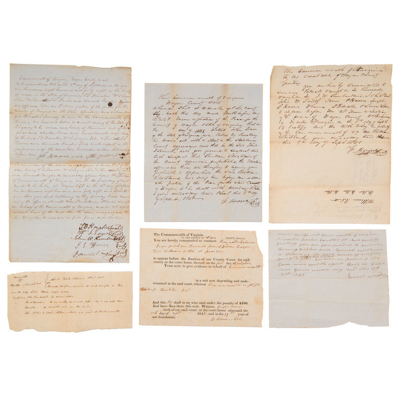 Six documents relating to a murder in Wayne Co., VA (“killed by knocking his brains out with a stool”). 1848