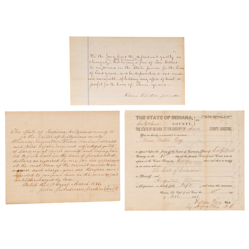 Four pieces from a Switzerland County, Indiana case of theft involving Mattie Gray, and three more pieces from the same case involving one Augustus Bloom. March 1866