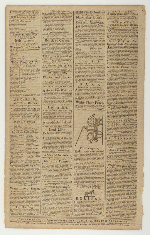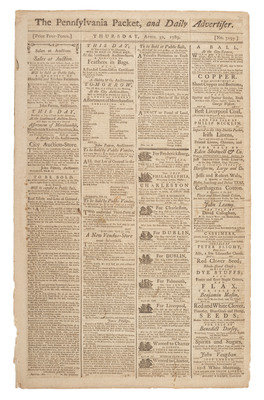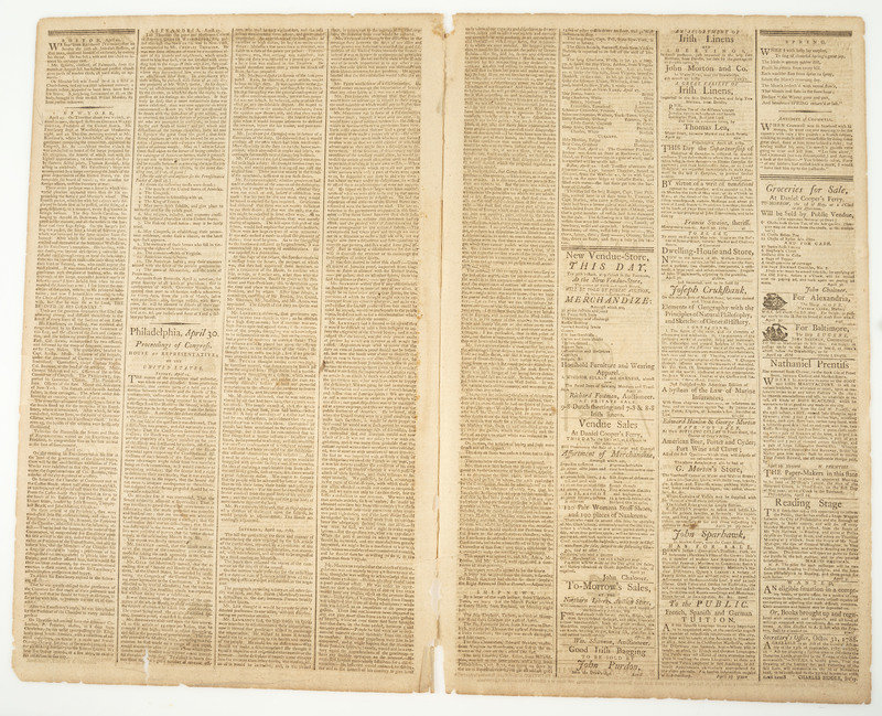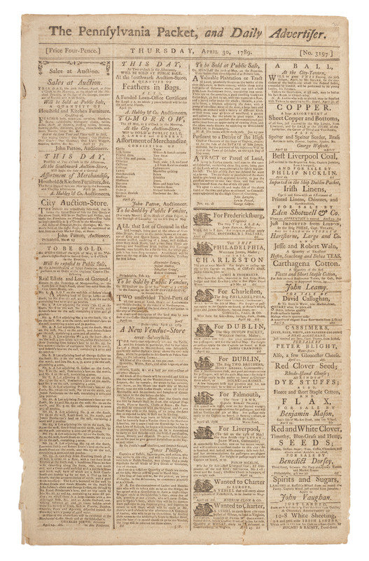 [WASHINGTON, George (1732-1799)]. The Pennsylvania Packet, and Daily Advertiser. No. 3197. Philadelphia: John Dunlap and David C. Claypoole, 30 April 1789.
