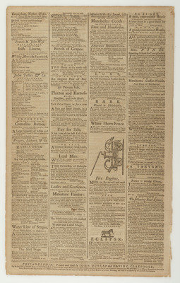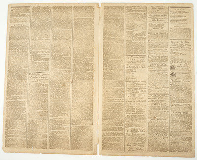 4pp., folio, 11 1/4 x 18 in. Disbound (partial separation at centerfold, partial separation at some horizontal fold lines, toning, occasional spotting, chipping, some loss at edges and corners). Provenance: Library of Stephen Foreman (blindstamp on newspaper, p.3, lower right).