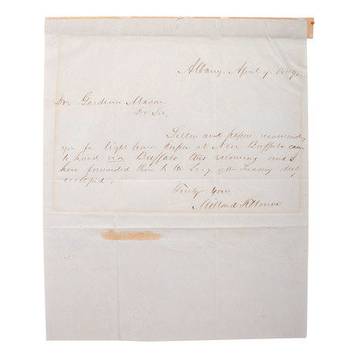 FILLMORE, Millard (1800-1874). Autograph letter signed ("Millard Fillmore") to Dr. Gardner Mason. Albany, New York, 9 April 18?. 1 page, 8vo, toned, some paper residue.