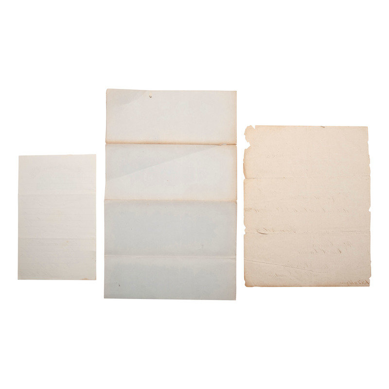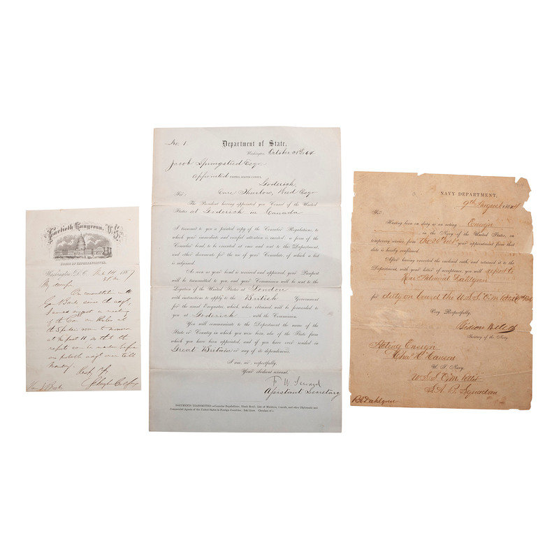 WELLES, Gideon (1802-1878). Document signed as Secretary of the Navy ("Gideon Welles"). Navy Department, 9 August 1864. 1 page, 8 x 10 in., on Navy Department letterhead, Toning, fold lines surface wear, chipping/minor loss at edges and corners. -- COLFAX, Schuyler (1823-1885). Autograph letter signed ("Schuyler Colfax") to J. Brook (?). Washington, DC, 14 March (?) 1867. 1 page, 5 x 8 in., on Fortieth Congress US House of Representatives letterhead, fold lines, short tear at right edge, near top fold line, few spots. -- SEWARD, Frederick W. (1830-1915). Department of State document signed ("F.W. Seward"). Washington DC, 21 October 1864. 1 page, 8 3/8 x 13 1/8 in., on Department of State letterhead, old creases ith toning and small separations.