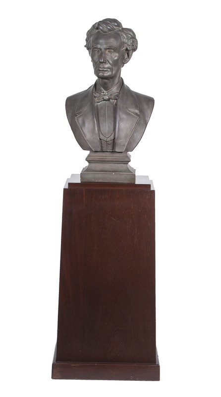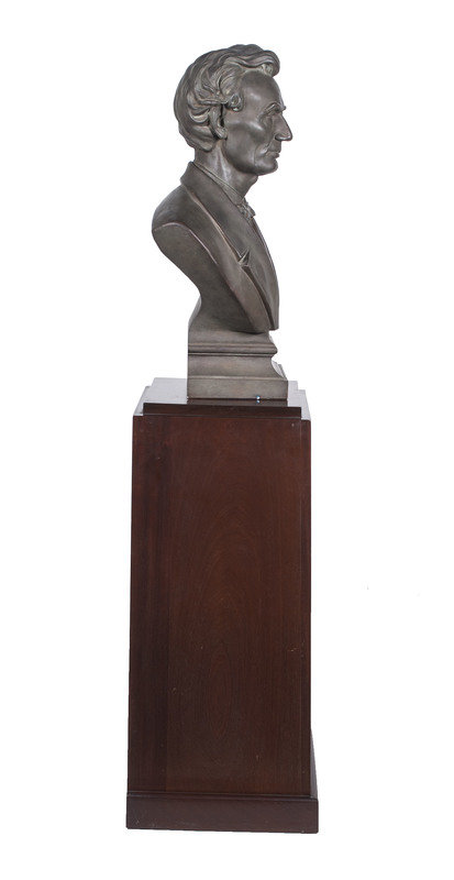 Unsigned plaster sculpture, approx. 10 x 29 x 8.5 in. Lincoln is depicted beardless, clad in a jacket, buttoned vest, and bow tie. A thoughtfully rendered likeness of Lincoln, with heavy brows and prominent cheekbones.