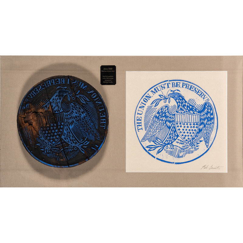 [With:] CORONATO, Bob, artist. The Union Must Be Preserv'd. Woodblock print, n.d., approx. visible 12 x 12 in., on wove paper, matted and framed in same plexiglass box, not examined out of box. Appears to have been printed from an earlier state of the block or significantly retouched as the section of the shield and wing is complete in the print though some of the block's cracks are present. Coronato graduated from the Otis/Parsons Institute of Fine Art in Los Angeles, and moved to Wyoming to pursue a career as a cowboy artist. His work has been shown at the High Plains Museum.