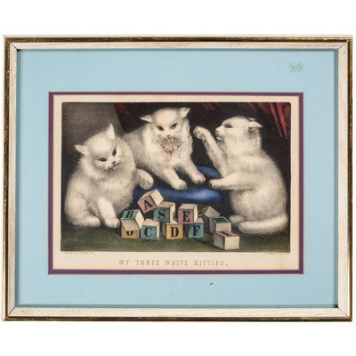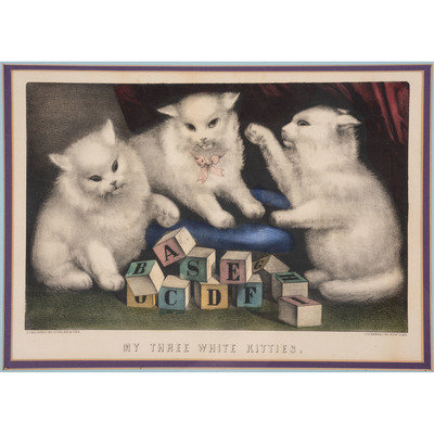 My Three White Kitties. New York: Currier & Ives, n.d. 13 3/8 x 9 1/2 in. lithograph (visible area), matted and framed, 18 3/4 x 15 1/4 in. (few minor spots, unexamined out of frame).