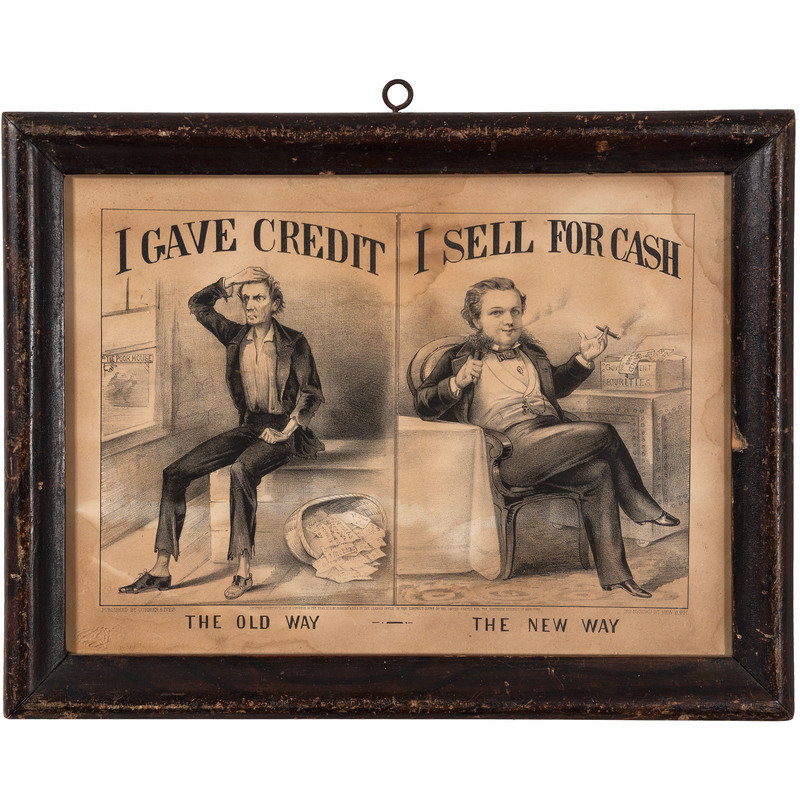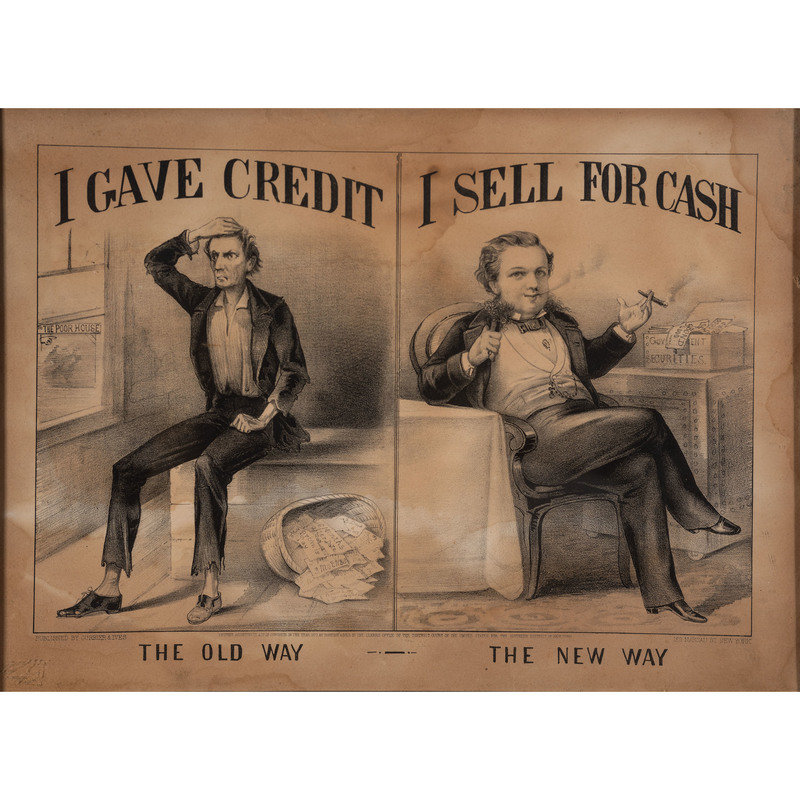 I Gave Credit (The Old Way) / I Sell for Cash (The New Way). New York: Currier & Ives, 1870. 14 1/2 x 10 1/2 in. lithograph (visible area), framed, 17 x 13 1/4 in. (toning, some water stains, unexamined out of frame). Features a disheveled Lincoln at left beside sign for "The Poor House," and a comfortable looking fellow at right seated beside a "Government Securities" chest overflowing with US bonds.