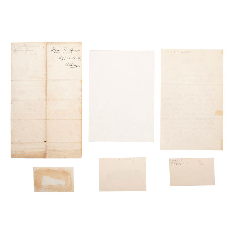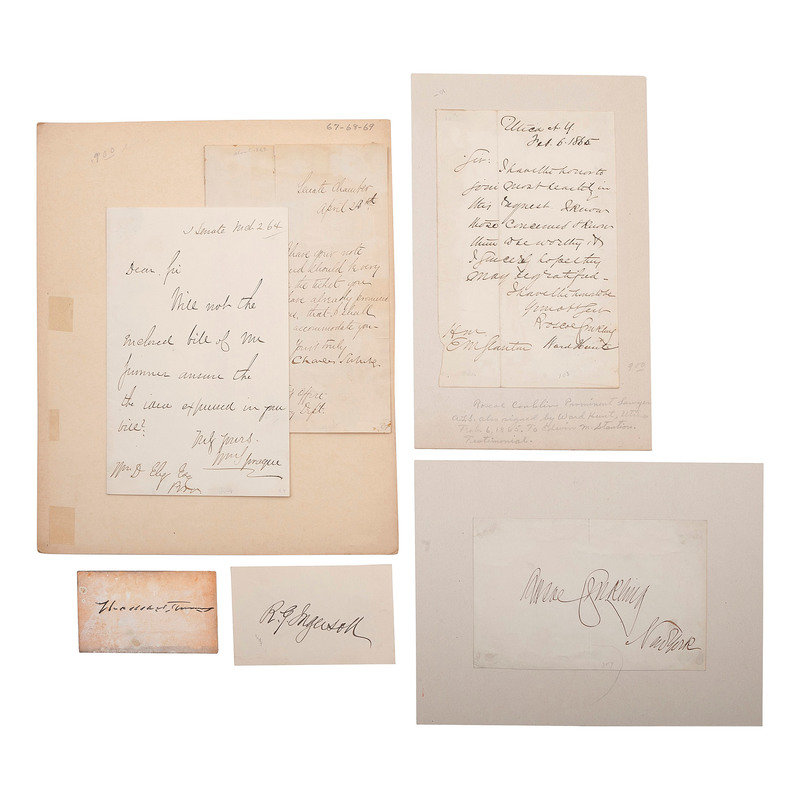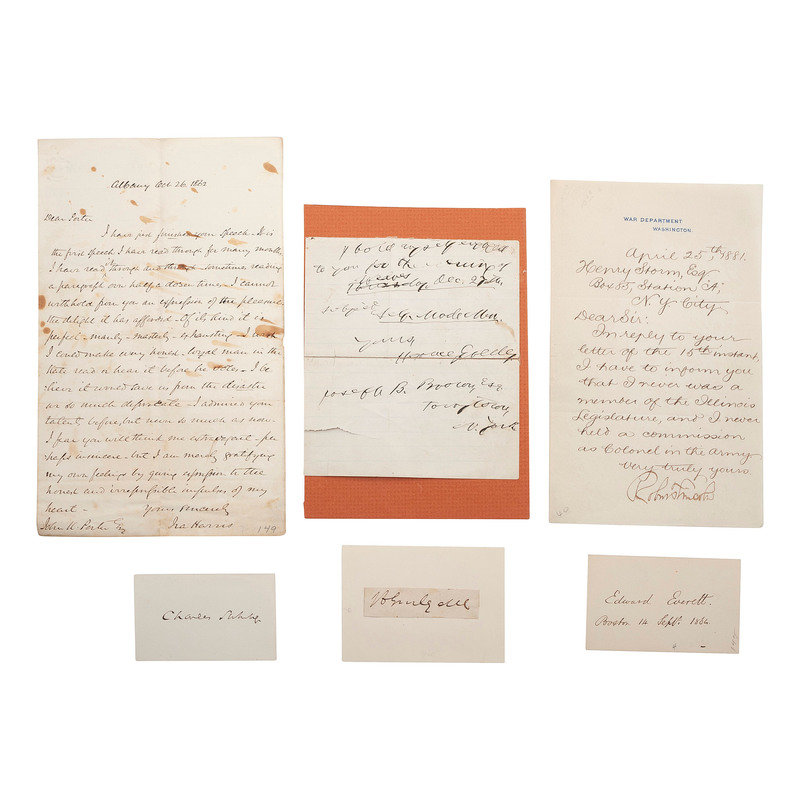 A group of 12 autographs of mid-to-late 19th-century politicians and statesmen, many associated with Lincoln, incl. Charles Sumner, Edward Everett, Thaddeus Stevens, Horace Greeley, and Robert Todd Lincoln, comprising: