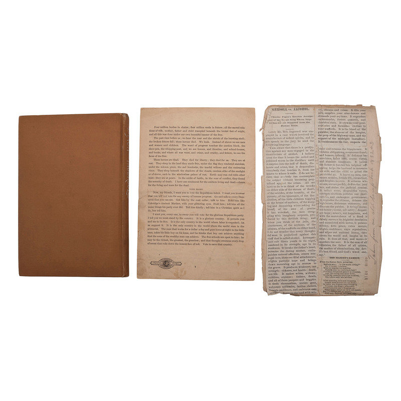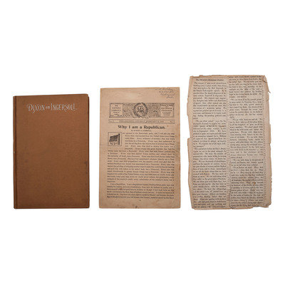 DIXON, Jr., Thomas. Dixon on Ingersoll. New York: John B. Alden, [1892]. 8vo, illustrated. Original publisher's brown cloth. Provnance: H[Henry] Storm, 1892 (ownership inscription to front free endpaper).
