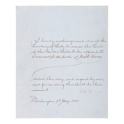 HAYES, Rutherford B. (1822-1893). Partly-printed document signed ("R.B. Hayes"), as President of the United States. Washington DC, 9 January 1880. 1 page, 4to, old creases.