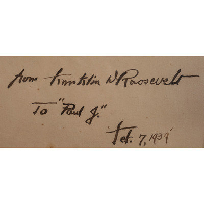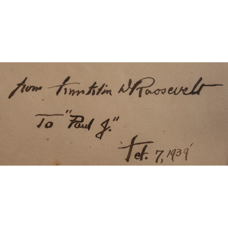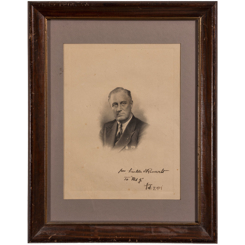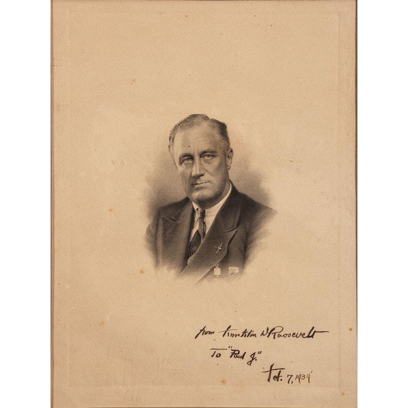 Engraved vignetted portrait of Roosevelt. Visible image 9 x 12 in. (some spotting); matted and framed 14 1/4 x 18 1/4 in. (not examined out of frame). SIGNED AND INSCRIBED BY ROOSEVELT TO "PAUL J."