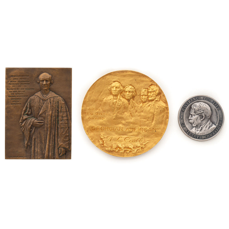 Silver medal, 1.5 in. diam. with “Reverence for Life / Dr. Albert Schweitzer” with Schweitzer’s profile on recto; “1875 / In Honor / of his Dedication / to Mankind / 1975” on verso.