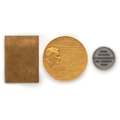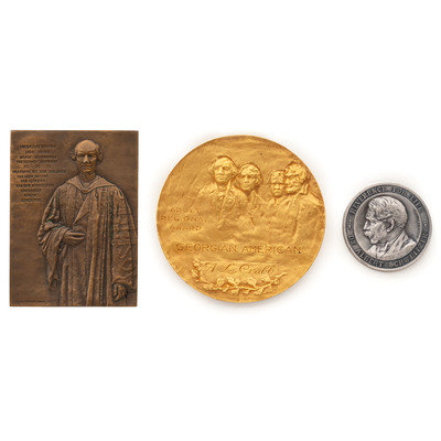 Bronze medal, designed aby Gutzon Borglum, 3 in. diam. Recto with extended version of Mt. Rushmore, “Adult Regional Award, Georgian American” and “A.L. Crabb.” Verso with profile of FDR and “Committee of Award of the Mt. Rushmore National Memorial Inscription. President Franklin D. Roosevelt Chairman. United States Senators” (followed by a list of 16 names, not all of them senators). In its original velvet and watered silk-lined box, but one side has broken away. This is a rather heavy medal for its size.